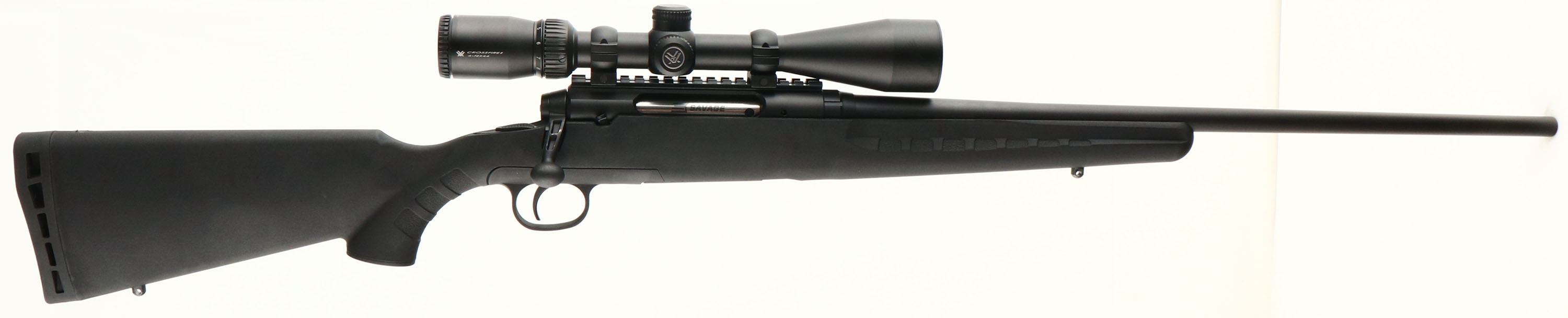 Savage, Model Axis, CAL: .22-250 REM, MFG: Modern, SN: N154803, Bolt Action Rifle, 22 1/4'' Tapered round barrel. The original capped pistol grip synthetic stock is excellent, with very minor rubs or light use marks. The original metal finish 99% overall. Bore is excellent. The receiver is fitted with a Vortex Crossfire 4-12x44 scope, & no open sight provisions on the barrel. Stock carries a factory ventilated recoil pad. Sling studs. Detachable mag. FFL Req. - Value: 400 to 600