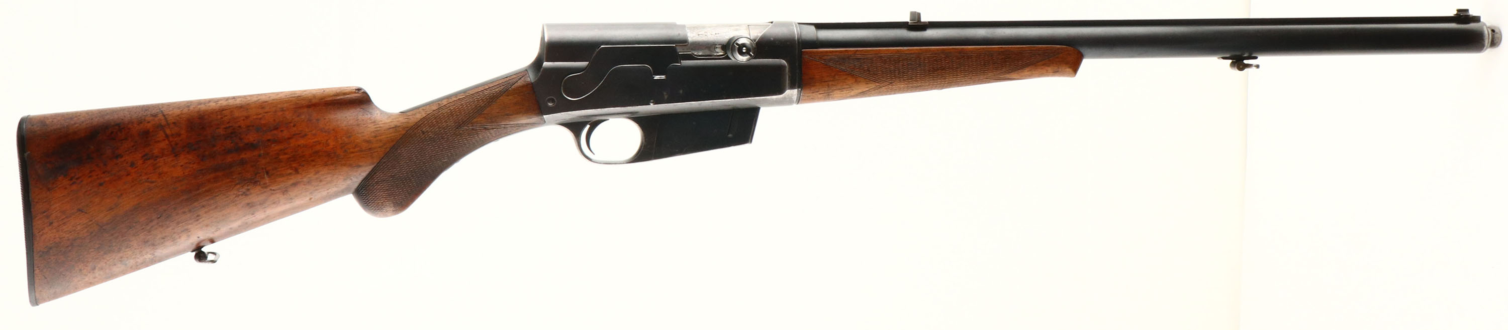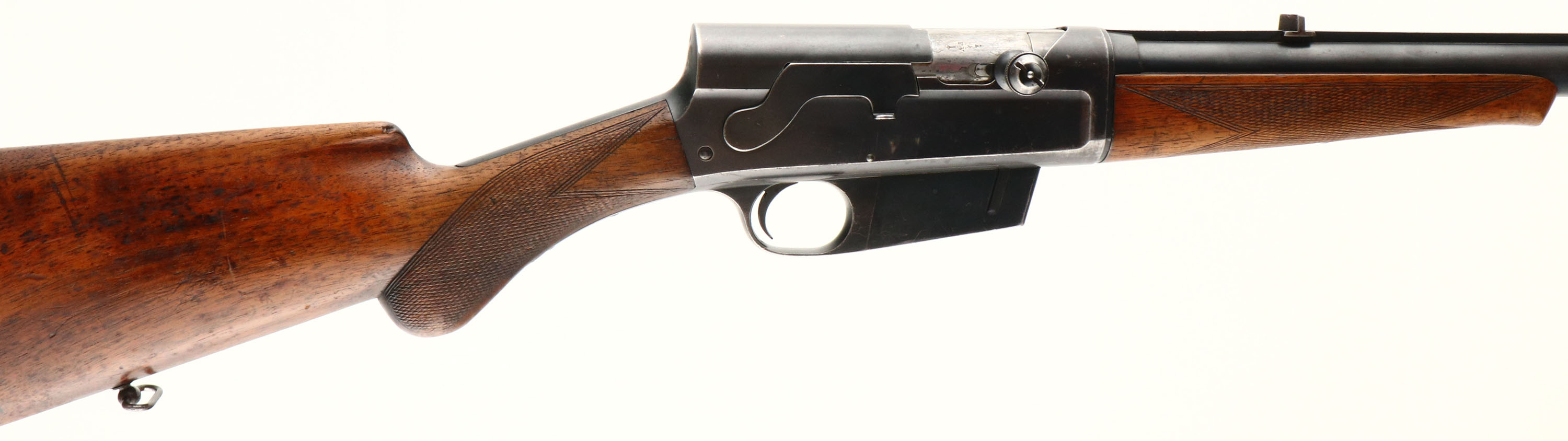 RARE FN (Fabrique Nationale), Model 1900, .35 Rem Cal., MFG. 1910-36, SN: 240, Semi-Auto Rifle, 22'' barrel, In Belgium it was known as ''La Carabine Automatique Browning'', in Germany it was the ''Selbstladebchse Browning Kaliber 9mm'', but in the U.S. we know it simply as the F.N. 1900. Records indicate only 4,913 Modele 1900's were ever produced. While records indicate 2909 rifles were produced for the years 1910-21, with no allocation to a particular year during that time, it is likely that SN 240, is a first or 2nd year production rifle. This rifle, invented by John Browning, was one of Europe's first successful semi auto high-power rifle. FN obtained the rights to produce the rifle as early as 1902, however, they chose to focus their production efforts on the A5 shotgun, which they acquired production rights to at the same time. They correctly viewed greater consumer sales potential in the A5. By 1904 restrictive importation tariffs into the U.S. caused Browning to negotiate with FN to allow manufacture of his shotgun within the U.S. The Remington Arms Co. was eager to work with John Browning & acquire the rights to manufacture both his autoloading shotgun & his autoloading rifle. FN was first to introduce the long-recoil shotgun (A5), but it was Remington that first produced John Browning's long-recoil rifle in 1906, dubbed the ''Autoloading Rifle'' or more commonly known today as the Model 8. If the Remington Model 8 is the grandfather of American semi-automatic sporting rifles, the F.N. 1900 is its European twin. The FN model 1900 was marketed throughout the world except the U.S., while the model 8 was intended for the U.S. market. Production comparisons place the model 8 at around 70,000, nearly a 14 to 1 difference. Since the FN was not sold in the U.S. market, few examples of the limited 4913 total produced are found amongst collectors in the U.S. It is known that some were vet bring-backs from two World Wars & at least a few were imported by Val Browning into the US. Since the FN was exported to Canada, some have made their way south of the border. Regardless of how they arrived, they are rare & very desired amongst Remington 8 & 81 collectors. Produced with old-world craftsmanship, these rifles are a testament to Fabrique Nationales word-wide reputation for manufacturing high quality firearms. It doesn't take long to notice there were probably more hours of labor involved in producing the FN over the Remington. A close inspection & disassembly of both rifles will reveal a significantly superior fit & finish with the Belgium made version, even over early production Model 8s. The FN came in two versions, neither of which were a higher grade than the other. One version had a standard barrel jacket like the Model 8, the other a solid barrel rib running the length of the jacket, which is the case with this example. These take-down rifles were often broken down into the 22'' & 20'' halves & placed into travel cases. The rifle has an English walnut round knob pistol grip stock & schnabel tip forend. Hand cut factory checkering is 20 lines-per-inch, with the early 1st style forearm checkering pattern. All hand fit & assembled, to that point stocks do not always interchange one rifle to another & factory LOP can vary by as much as a full inch. The stocks original condition is excellent, with thinning finish wear, minor handling scuffs, scratches & dings. The original metal blue finish is approximately 85% overall, with blue thinning at the carry points of the receiver & barrel & some minor scratches. The left side of the receiver carries the factory roll stamp & proof markings. Bore is very good. Barrel is fitted with replacement fixed rear sight & Lyman front sight. FN horn buttplate. Replaced sling loops. Some denting to the belly of the magazine. Tight action & functions as it should. An overall excellent & eye catching example of this rare & highly collectible early production rifle. FFL or C&R Req. - Value: 3000 to 4500