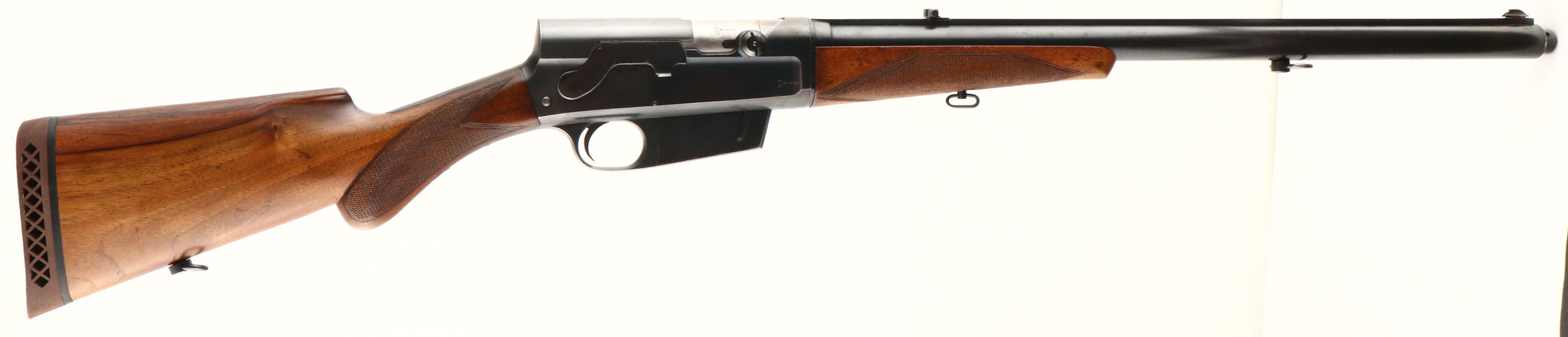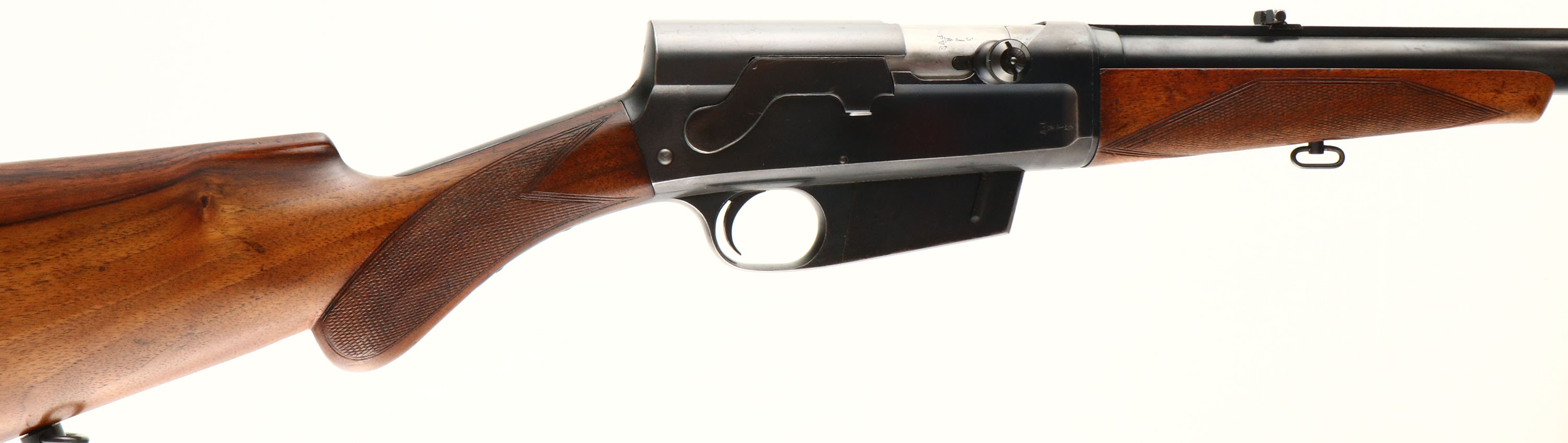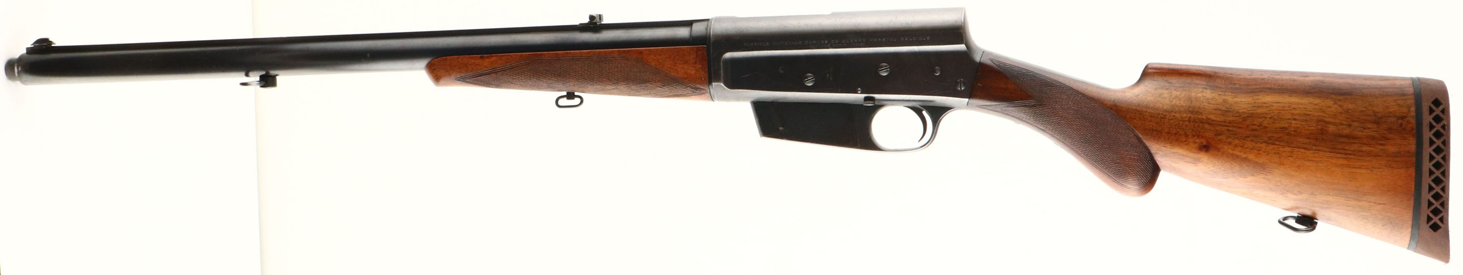 RARE FN (Fabrique Nationale), Modele 1900, .35 Rem Cal., MFG. 1926, SN: 4267, Semi-Auto Rifle, 22'' barrel, Made in Belgium & one of only 4,913 Modele 1900's produced. The rifle has the original English walnut round knob pistol grip stock & schnabel tip forend. The hand cut factory checkering is 20 lines-per-inch, with the late 3rd style forearm checkering pattern. The stocks condition is excellent, likely having been cleaned & reoiled. There are very few light handling marks or scuffs to the wood & finish. The checkering is very good, with some smoothing found mostly on the forend. The original metal blue finish is approximately 80% overall, with blue thinning at the edges & carry points & some minor scratches. The left side of the receiver carries the factory roll stamp & proof markings. Bore is very good. The solid barrel rib runs the length of the jacket & is fitted with the original two position flip box rear sight & front blade sight dovetailed into the barrel rib. The back of the receiver has two open holes where it appears a Redfield tang/receiver sight may have once been mounted. Stock has been cut to fit a Pachmayr ventilated recoil pad. Replaced sling loops. Tight action & functions as it should. A very nice late production example of this rare & highly collectible rifle. FFL or C&R Req. - Value: 2500 to 3500