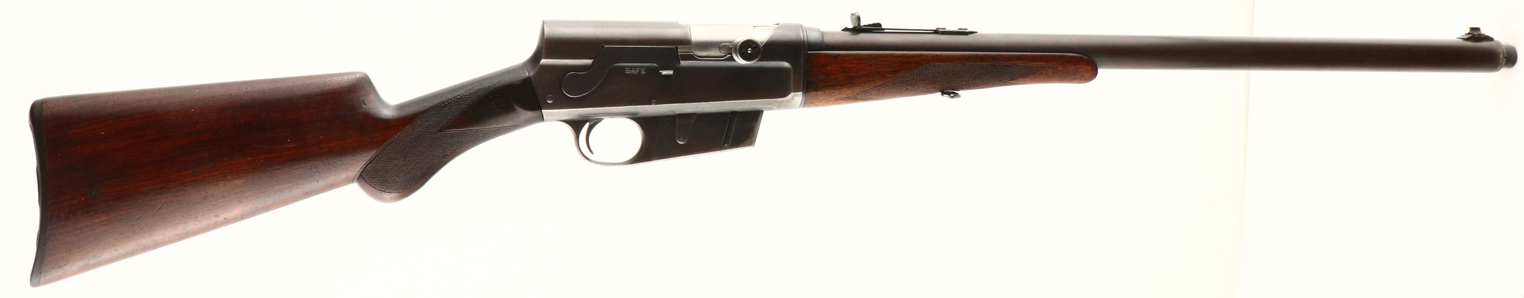 Remington, Model 8C (Deluxe), marked .32 Rem Cal., MFG: 1909, SN: 16907, Semi-auto take-down rifle, 22'' barrel, The original deluxe checkered & round knob pistol grip wood stocks are excellent & solid. The inside of the forend is stamped with a 3 for grade ''3'' or ''C'' grade, & they display hand checkering cut at 20 lines per inch. Being an earlier production rifle & a C grade, the stock carries the cheeks at the wrist. There are minor scrapes, scratches & contusions to the original finish. There are two thin & tight grain or stress cracks emanating from the upper tang & running rearward. The original metal blue finish is toning to a thin brown patina, with mostly full coverage. Some area have worn gray, while other areas retain darker blue finish. The receiver has an open factory hole from previous tang sight, while the barrel carries an adjustable rear & standard front sight. Bore is very good, clean & bright. Stock carries the Remington plastic buttplate. 5 rd fixed magazine. Tight action. A rare & very nice original ''C'' grade deluxe rifle, which is very collectible. FFL or C&R Req. - Value: 2000 to 3000