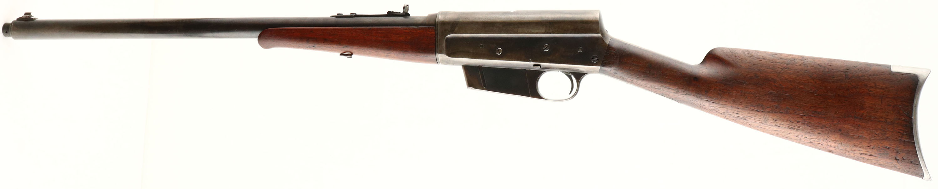 Remington, Model 8, .30 Rem Cal, MFG. 1916, SN: 37693, Semi-Auto Rifle, 22'' barrel. The original straight grip & schnabel forend stocks are very good & solid. Then stock appears to have been sanded & reoiled some time ago & has developed a nice aged tone. There are several small areas on the stock that have fill add back when it was sanded to fill larger contusions. The metal is slightly proud to the wood on the stock. The forearm has been sanded more recently & carries a thin layer of finish. There remains several small to large scuffs, scratches & contusions to the wood, along with a small 1/4'' stress crack emanating from the upper tang. The original metal blue finish has mostly worn away, with some remains on the barrel. The barrel & receiver have a layer of cold blue add which gives it a spotty & thin brown color. Spotty pitting & rust speckling are found on both the barrel & left side of the receiver. Bore is very good, bright & clean. The barrel carries standard front & rear sights. Stock carries the Remington UMC upper tang crescent metal buttplate polished silver. 5 round fixed magazine. Tight action. Would like make a good hunting rifle or shooter. FFL or C&R Req. - Value: 400 to 600