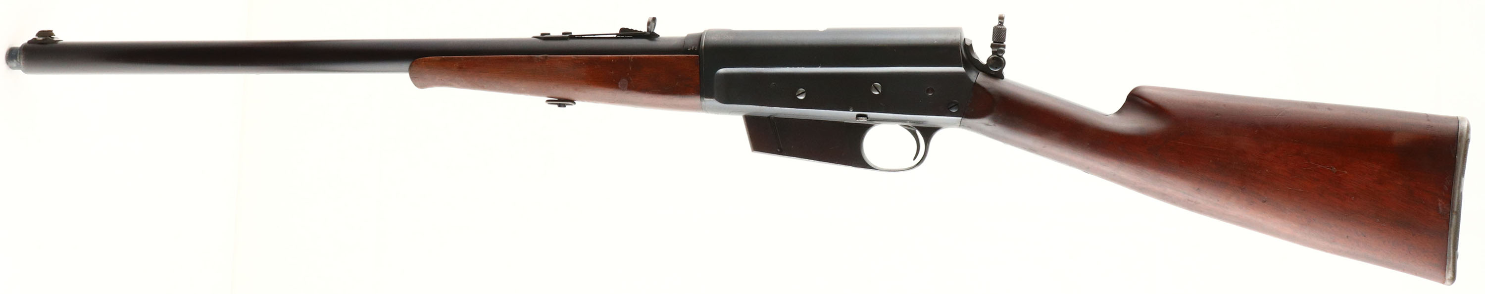 Remington, Model 8, .35 Rem Cal, MFG. 1916, SN: 38092, Semi-Auto Rifle, 22'' barrel. The original straight grip & schnabel forend stocks are very good to excellent. The stock has been cleaned or possibly lightly sanded, & refinished. The forearm carries the original finish, with a thin added layer of finish. There are several minor to small scuffs, scratches & contusions to the wood & finish. The original metal blue finish rates 80% overall, with the finish on the mag & safety lever toning a plum/brown. Bore is excellent. The receiver carries a Lyman tang sight, while the barrel carries a standard adjustable rear sight & Marble Sheard elongated blade front sight. Stock carries the rarely found checkered reverse teardrop Remington UMC metal buttplate. 4 round fixed magazine. Tight action. An excellent looking & nicely configured rifle. FFL or C&R Req. - Value: 600 to 1000