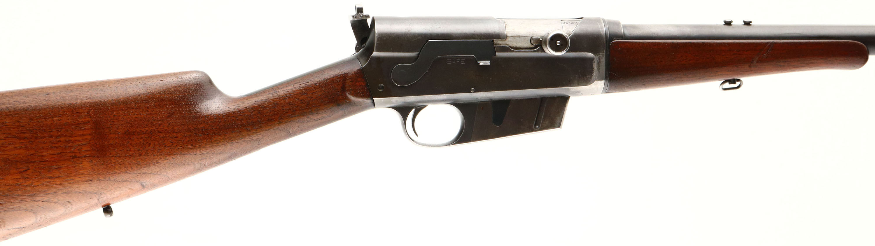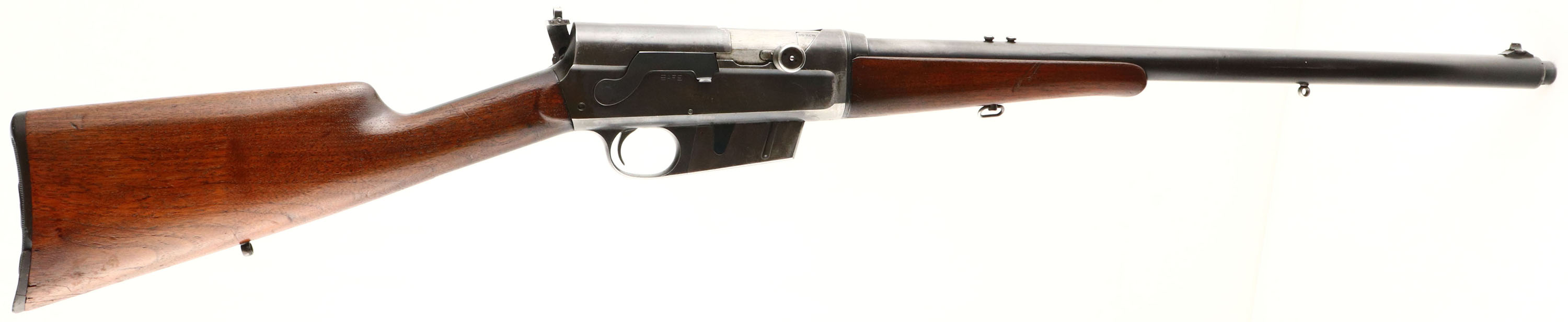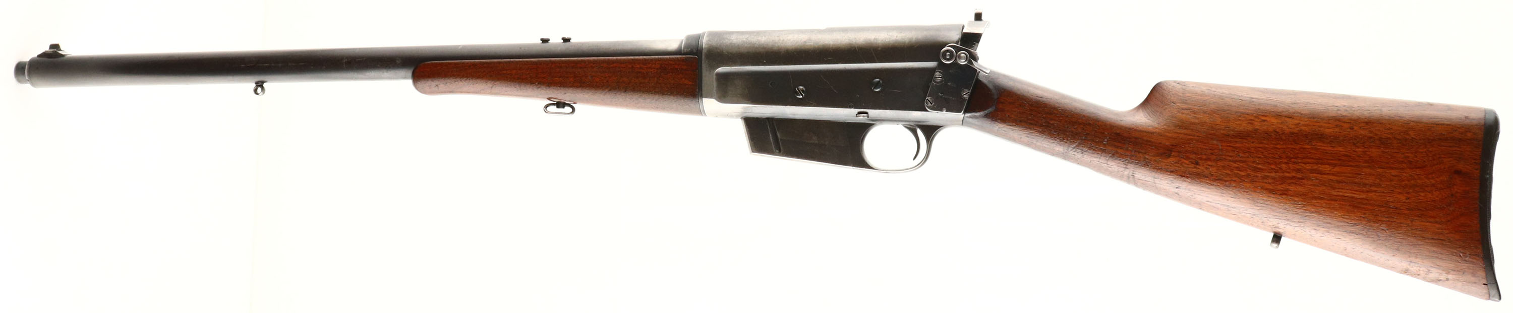 Remington, Model 8, .35 Rem Cal, MFG. 1910, SN: 18884, Semi-Auto Rifle, 22'' barrel. The original straight grip & schnabel forend stocks rate only as good due to a glued toe break repair & a 2'' stress crack on the belly of the forend. The break in the toe also broke the plastic buttplate in several places, which has been glued, but is missing a small chip along the right edge & a small chunk by the lower screw. The stocks both carry an added layer of finish carelessly applied, causing finish to also get on the receiver & tangs. There are also several small scuffs, scrapes & contusions to the wood & finish. The original metal blue finish rates 60% on the barrel, 40% on the receiver, with much of the wear located on the forward portion of the receiver & the back portion of the barrel, likely from carry use. The is a small dent in the top of the receiver. Bore is excellent. The receiver carries a Lyman 41 left side mounted receiver sight, while the barrel carries just rear sight screws & a Lyman blade front sight. Sling eyelets. 4 round fixed magazine. There is a repair code on the left side of the barrel from where the rifle was returned to the factory for unknown repair or upgrade, ''EW3''. The action is sticky & the bolt doesn't automatically release when bolt release button is pushed. It requires the bolt handle to be firmly pulled back while button is pushed down & then released for bolt to slam forward. Gun was heavily used & quite dirty or gummed up & could use a good cleaning, which could improve functionality. A little work might drastically improve aesthetics & smoother functionality. FFL or C&R Req. - Value: 400 to 600