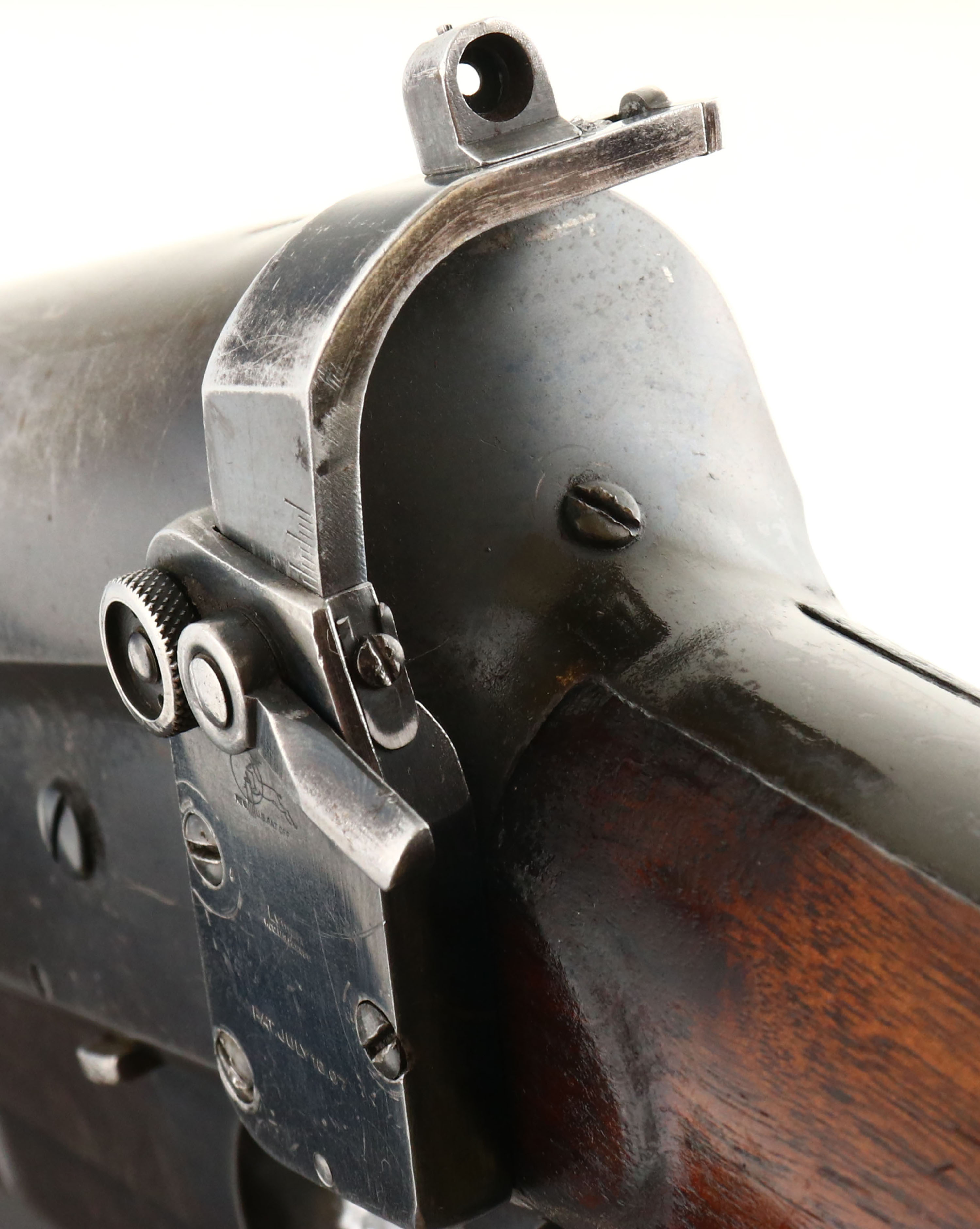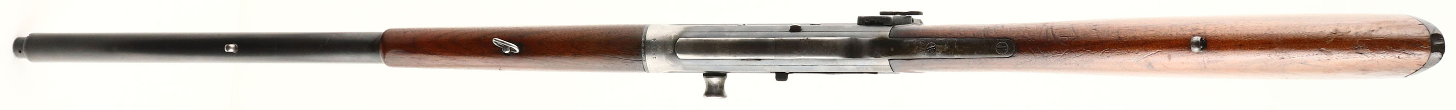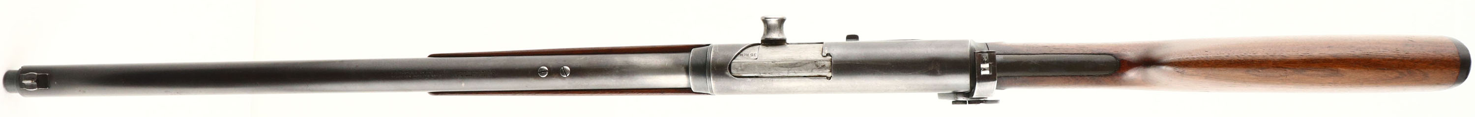 Remington, Model 8, .35 Rem Cal, MFG. 1910, SN: 18884, Semi-Auto Rifle, 22'' barrel. The original straight grip & schnabel forend stocks rate only as good due to a glued toe break repair & a 2'' stress crack on the belly of the forend. The break in the toe also broke the plastic buttplate in several places, which has been glued, but is missing a small chip along the right edge & a small chunk by the lower screw. The stocks both carry an added layer of finish carelessly applied, causing finish to also get on the receiver & tangs. There are also several small scuffs, scrapes & contusions to the wood & finish. The original metal blue finish rates 60% on the barrel, 40% on the receiver, with much of the wear located on the forward portion of the receiver & the back portion of the barrel, likely from carry use. The is a small dent in the top of the receiver. Bore is excellent. The receiver carries a Lyman 41 left side mounted receiver sight, while the barrel carries just rear sight screws & a Lyman blade front sight. Sling eyelets. 4 round fixed magazine. There is a repair code on the left side of the barrel from where the rifle was returned to the factory for unknown repair or upgrade, ''EW3''. The action is sticky & the bolt doesn't automatically release when bolt release button is pushed. It requires the bolt handle to be firmly pulled back while button is pushed down & then released for bolt to slam forward. Gun was heavily used & quite dirty or gummed up & could use a good cleaning, which could improve functionality. A little work might drastically improve aesthetics & smoother functionality. FFL or C&R Req. - Value: 400 to 600