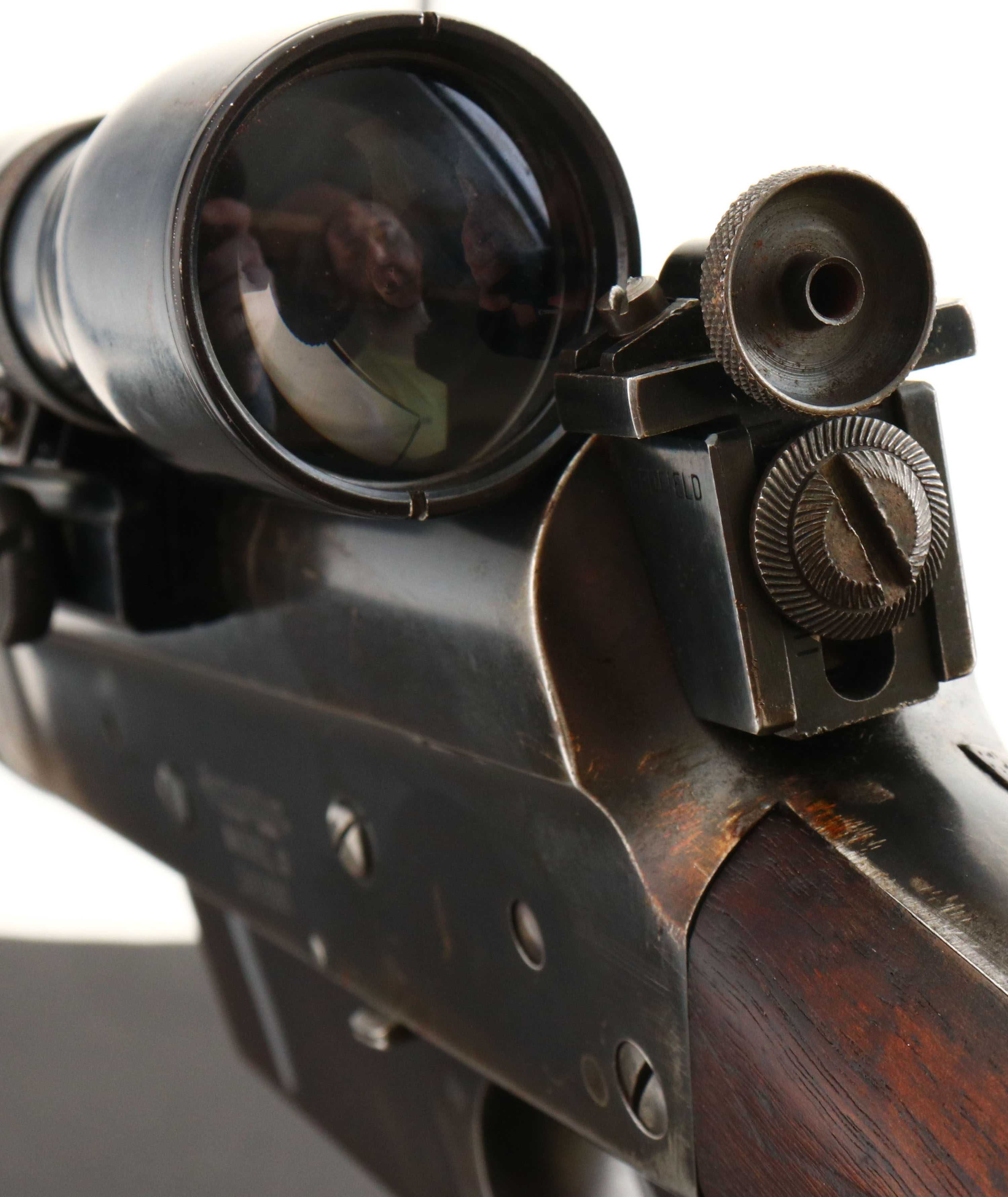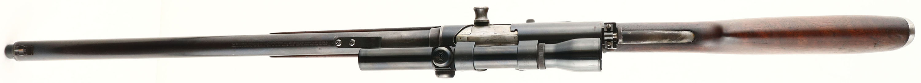 Remington, Model 8, .300 SAV Cal, MFG. 1929, SN: 58998, Semi-Auto Rifle, 22'' barrel. It is likely this rifle began life as a 35 REM caliber rifle. In 1936 Remington felt the model 8 needed a facelift & introduced the model 81, which was little more than a minor cosmetically changed model 8. A few short years later, in 1940, Remington released the model 81 in 300 Savage caliber. This caliber proved very popular amongst many big game hunters. As a result, some model 8 owners chose to return their rifles to the factory to have them swapped to 300 Savage. This was done with very little modification or adjustment to the rifle other than swapping the barrel for a 300 SAV barrel. The left side of the barrel shroud would have been stamped with a repair/upgrade code, which this rifle has, ''AUU3''. The original straight grip & schnabel forend stocks are very good. The stocks carry the original finish, but the forearm carries a thin added layer of finish due probably to much previous wear. The stocks have darkened some from oils & use. There are several minor to small scuffs, scratches & contusions to the wood & finish. The original metal blue finish rates 60% overall, with most of the finish wear to the carry points of the front of the mag, belly of the receiver & back portion of the barrel. There are several small nicks or abrasions to the back edges of the receiver & tangs. Bore is excellent. The receiver carries both a Redfield receiver tang sight & a vintage period scope on Weaver rings & Weaver quick detachable mount. The barrel carries a Marbles rear base & a Marble Sheard elongated front sight. Stock carries the bottom tang Remington UMC crescent metal buttplate, which has worn or been polished silver. 4 round fixed magazine. Tight action. A uniquely configured model 8 hunting rifle. FFL or C&R Req. - Value: 600 to 1000