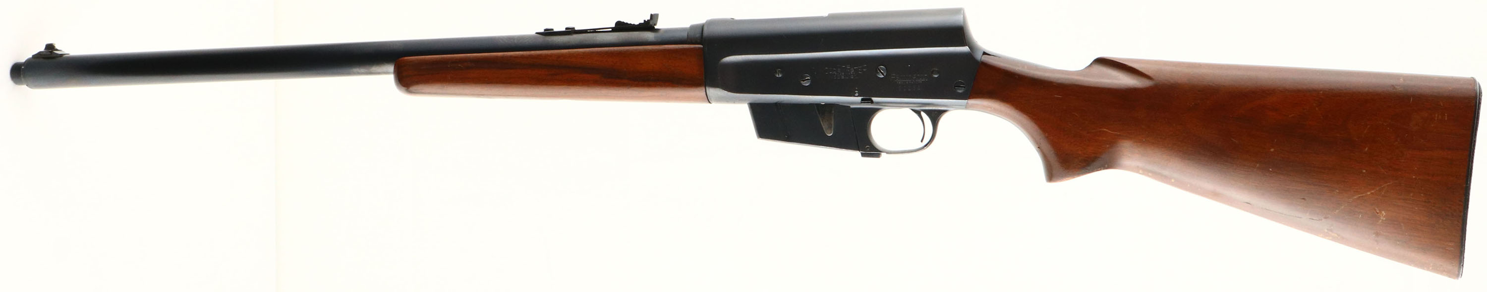 UNIQUE Remington, Model 81 KRIEGER (Modified detachable clip), marked .35 Rem Cal., MFG. 1949, SN: 50262, Semi-auto take-down rifle, 22'' barrel, One of the features hunters & shooters often hoped from Remington was a detachable magazine rather than the standard fixed mag. Remington never offered this feature in the model 8 or 81& thus many a gunsmith or garage fiddler attempted a conversion. Most were little more than butcher jobs that often compromised functionality. There are a few exceptions however, & the most notable is the work of R. Krieger & Sons of Mt. Clemens, Michigan. Their conversions were done using the rifles existing 4/5 round box magazine. What sets a Krieger apart from all other conversions is the outstanding quality of the machine work, an almost factory appearance. Krieger & Sons also had a gunsmiths working knowledge of the 8/81 action & knew the necessary alterations to ensure safe, reliable operation. It is not known how many of these conversions were performed, but we do know they were done in the late 1940s & early 1950s. Originally conversions were priced at $20. In 1951 Kriegers were advertised in NRAs American Rifleman, with conversions costing $25 & $12.50 per extra magazine. A Krieger is one of the few modification to an original factory rifle that does not typically detract from its value, rather most Krieger rifles demand a premium in todays collecting environment. On this rifle, the original factory flat grip wood stock & forearm are excellent, with several minor scuffs, scratches & contusions to the excellent finish. The upper corners of the wrist on each side have small slivers/chips of missing wood. The original metal blue finish rates 90% overall. However, there is a 1''X2'' area under the bolt handle on the right side of the receiver that once had a name or number etched into the metal. That has been removed or polished away & a cold blue finish has been used to try & cover the area. The barrel carries an adjustable rear & blade front sights. Stock carries the original checkered metal buttplate. Bore is excellent. 4 shot detachable magazine. A quality & very nice looking Krieger 81 rifle in the popular hunting caliber of 35 Rem. FFL or C&R Req. - Value: 1200 to 1800
