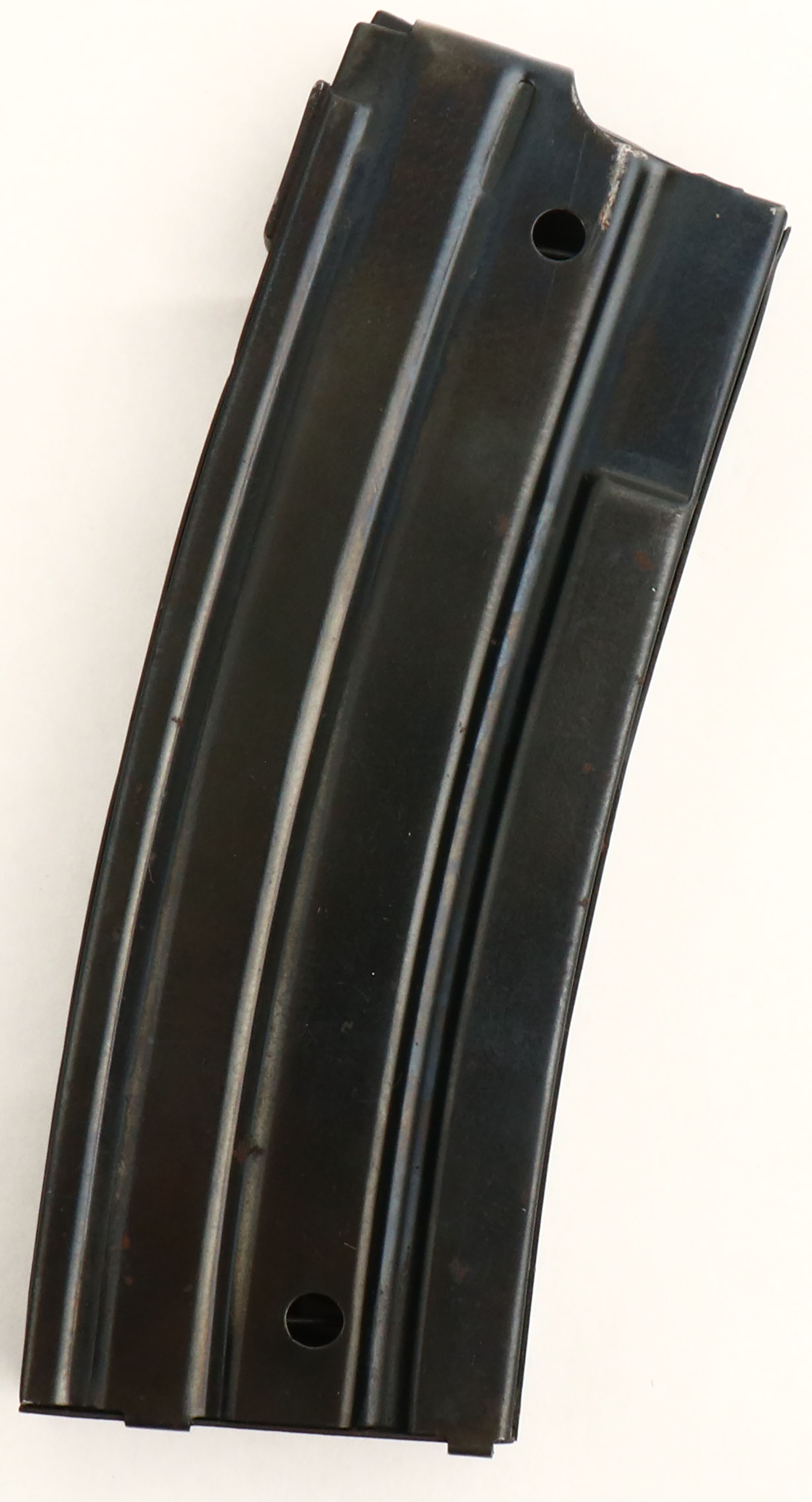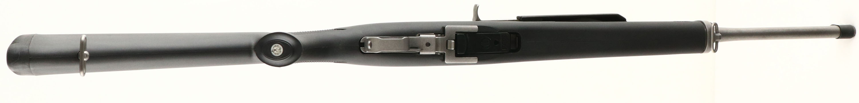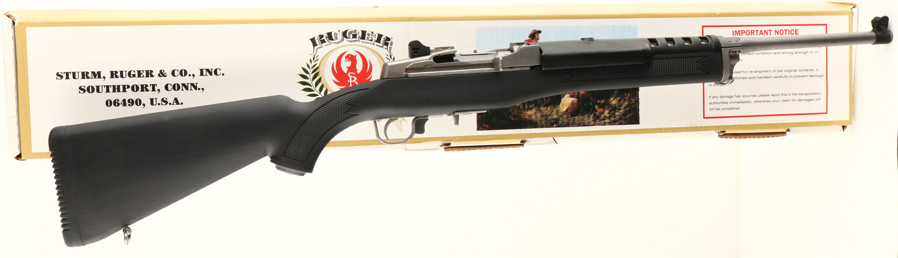 BOXED Ruger, Model Mini 14 Ranch Rifle, .5.56mm Nato (.223) Cal., MFG: 2014, SN: 582-96736, Semi auto rifle, 18 1/2'' barrel, The black synthetic checkered stock is near mint, The stainless metal is near 100%, Bore is excellent, Factory sights & sling loops. Original flush detachable mag. Came from inventory of closing gun store. Comes in a Ruger factory box, with factory paperwork & Ruger lock. Near mint rifle & a lot of fun to shoot. FFL Req. - Value: 800 to 1200