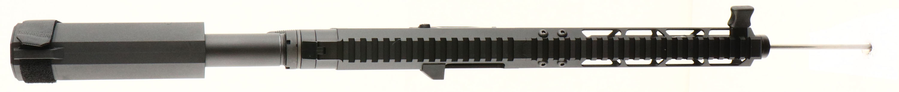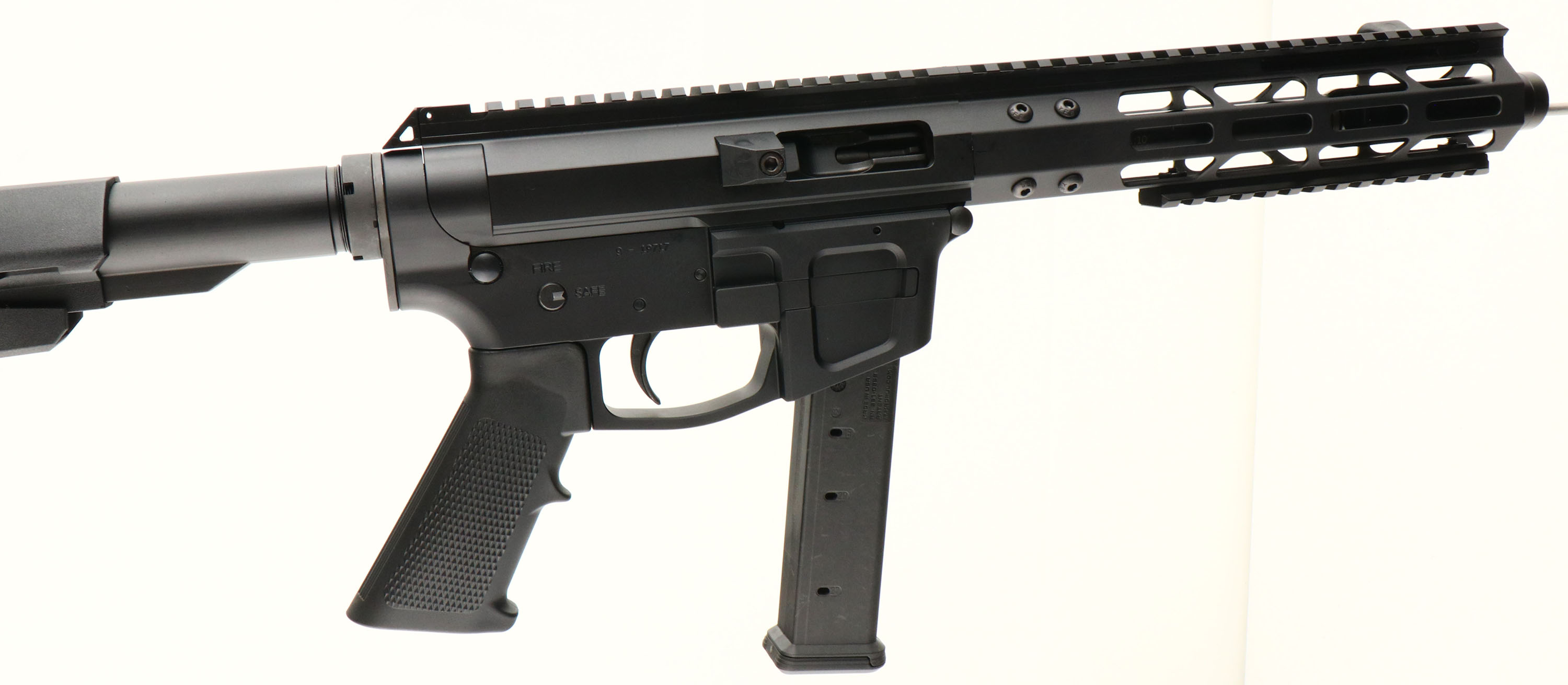 BOXED, F.M. Products INC, Model FMP-9, CAL: 9X19mm, MFG: Modern, SN: 9-19717, Semi Auto Pistol, 10'' barrel, 1:10'' twist rifling. The textured pistol grip & SB Tactical SBA3 slide adjustable pistol brace/stock are excellent. The metal finishes on the billet upper, lower & 8 1/4'' M-lok handguard are all excellent. HK MP5/G3 style forward charging handle. Bore is excellent. Has full length upper picatinny rail for optics or accessories. Comes with a PMAG 27 GL9 detachable mag. Comes in original shipping box with owner's manual, packaging & sticker. FFL Req. - Value: 600 to 1000