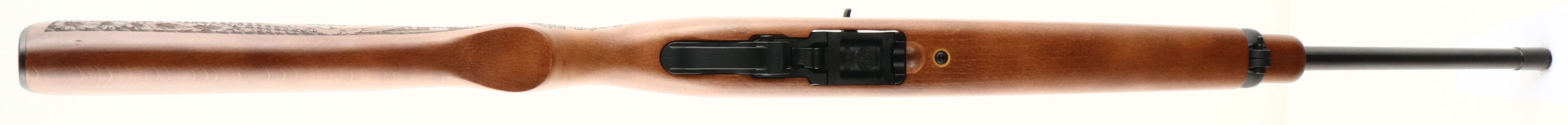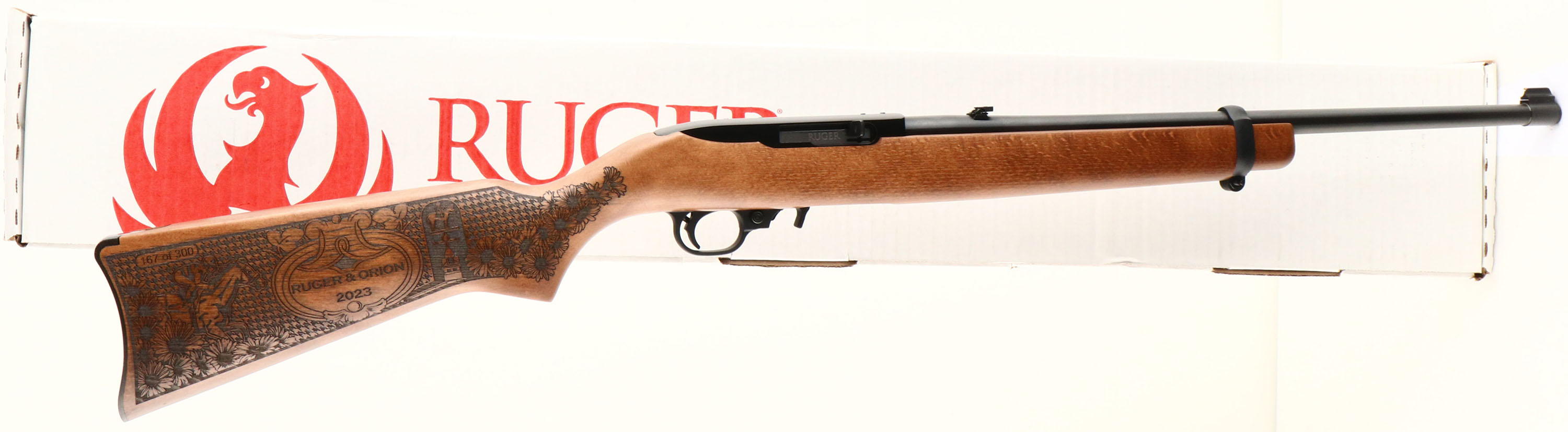 BOXED Ruger, Model 10/22 Carbine, RUGER & ORION EDITION CAL: 22 LR, MFG: 2023, SN: 0023-09410, Semi Auto Rifle, 18 1/2'' barrel. Marked 167 of 300. The factory flat pistol grip wood stock is excellent, with no handling marks to the original finish. The stock has a beautiful race horse & floral scene laser engraved on the right side. The original metal blue finish rates 99%+. Bore is excellent. The barrel holds a standard folding leaf rear sight & blade front sight. Stock carries a smooth plastic carbine buttplate. Detachable mag. Comes in the original box, with paperwork, lock & scope mounting bar. FFL Req. - Value: 300 to 500