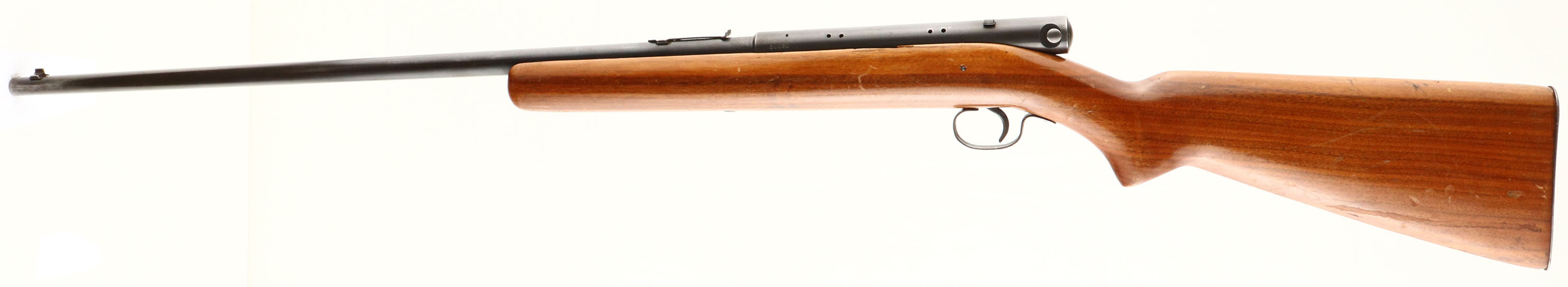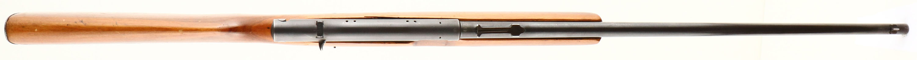 Winchester, Model 74, Marked .22 SHORT Cal., MFG. 1939, SN: 30020, Semi-Auto Action Rifle, 24'' round barrel. Tube mag fed through the buttstock. Collectors pay more for SHORT only variation & pre-WWII production. The factory flat pistol grip wood stock is good & solid, with several minor scrapes, scuffs & small contusions to the finish, along with one larger gouge on the right side of the stock behind the pistol grip. The original metal blue finish is thinning gray, with 60% coverage remaining on the barrel & receiver. The blue has mostly worn from the trigger guard. Bore is very good. Barrel carries an adjustable rear sight missing the elevator & standard front blade sight. Factory checkered metal buttplate. FFL or C&R Req. - Value: 150 to 300