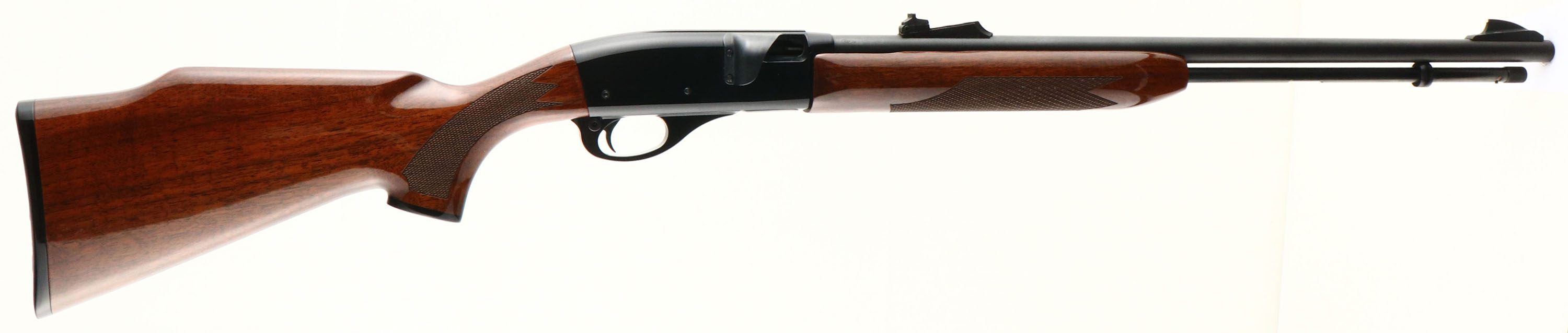 Remington, Model 552 Speedmaster, CAL: .22 S.L.LR, MFG: 1975, SN: D1400103, Semi Auto Rifle, 21 1/2'' barrel. The original checkered & capped pistol grip wood stock is excellent, with very few tiny handling marks to the excellent original high gloss finish. The metal black finish on the aluminum receiver rates 95%. The metal blue finish on the barrel & tube rates 95%. Bore is excellent. The barrel has the standard front & rear sights. Buttstock carries a Remington checkered black plastic buttplate. Shell deflector. FFL Req. - Value: 250 to 450