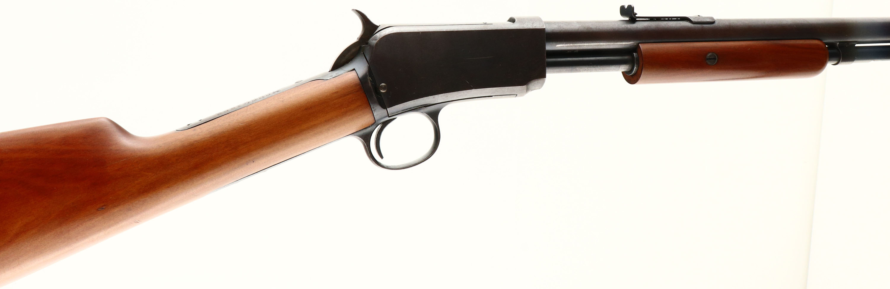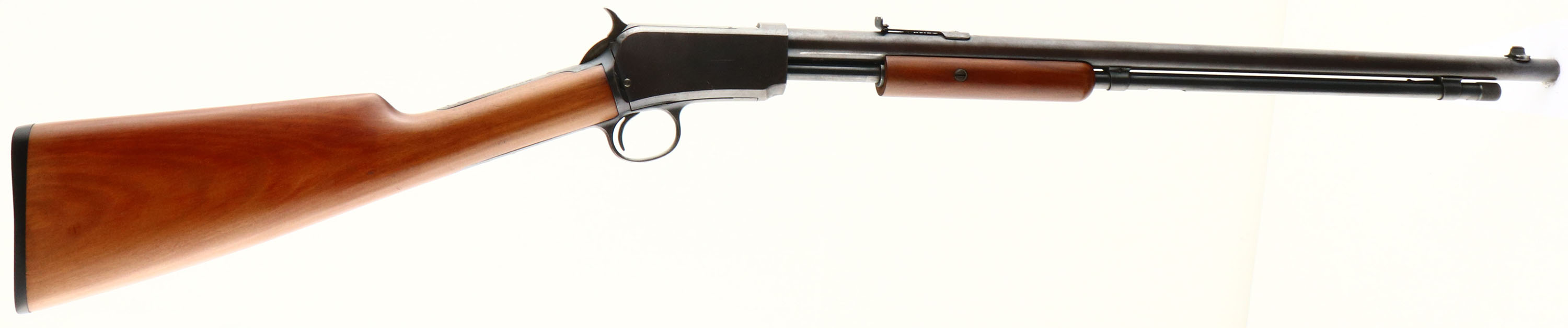 UNIQUE Winchester, Model 1906 , .22 SHORT., MFG: 1906, SN: 13760, Pump Action Rifle, 20'' Round barrel, This is a first year rifle, with British proof stampings on the barrel, bolt & receiver. It also carries the professional engraving of ''WILKINSON PALL MALL'' on the left side of the receiver. They were a British sword company that also sold guns & ammunitions. The original straight grip wood stocks are excellent. The forearm is the smooth style. The original finish is excellent, with virtually no rubs or handling marks. The original metal blue finish rates 75% overall, despite full coverage simply due to some thinning loss & barrel starting to tone slightly brown. Bore is good, but with areas of worn roughness amongst good rifling. Fitted with standard barrel sights. Winchester plastic buttplate, with engraved screws. Another truly excellent, original & collectible condition example. FFL or C&R Req. - Value: 1000 to 2500