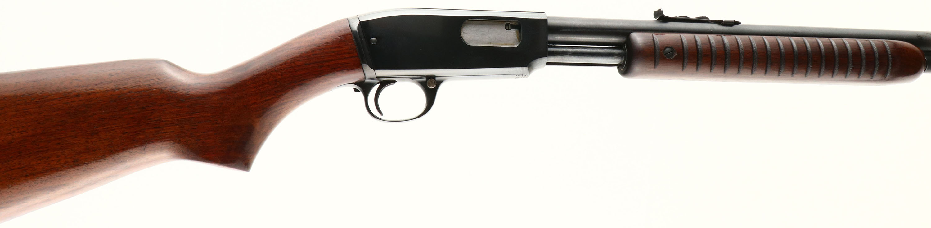Winchester, Model 61, CAL: 22 S, L & LR, MFG: 1956, SN: 231094, Pump Action Rifle, 24'' barrel. Take-down Rifle. 24'' tapered round barrel. Slotted receiver for potential scope. This rifle has been fully & professionally restored to near factory original standards. The factory flat knob pistol grip wood stocks are excellent, displaying excellent restored finish & only a few minor contusions or scuffs. The restored metal blue finish rates 98% overall, with wear loss due pump slide action. Bore is excellent. Standard open sights. Checkered factory plastic buttplate. Overall, an excellent condition & beautiful 61 rifle. FFL or C&R Req. - Value: 500 to 1000
