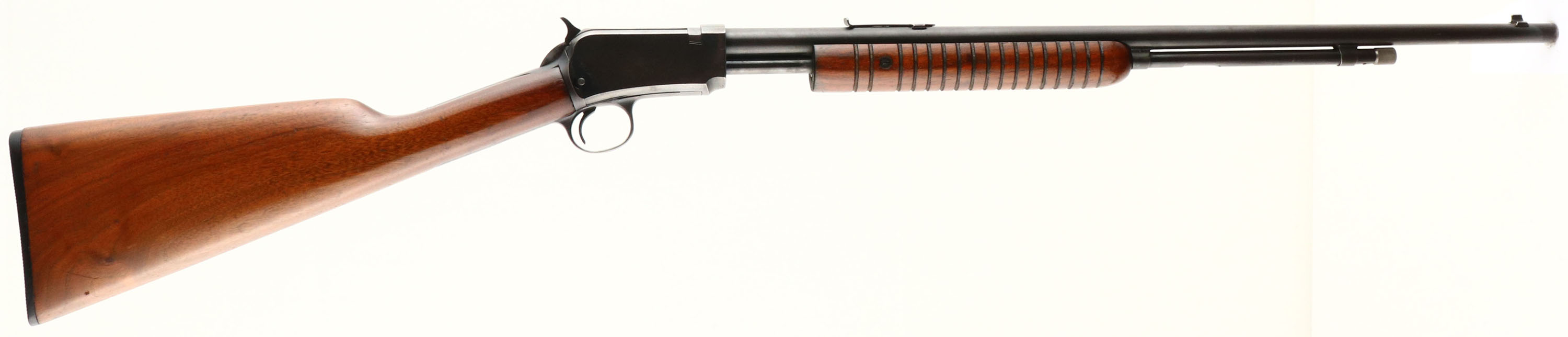 Winchester, Model 62A, CAL: 22 S.L.LR, MFG: 1948, SN: 251908, Pump Action Rifle, 23'' barrel. The original straight grip wood stock & corncob style forearm are excellent. They carry an added thin protective layer of finish over the original factory finish. There are a few light contusions, surface scrapes & rubs The metal blue finish rates 85% overall. Bore is excellent. The barrel holds an adjustable rear sight missing the adjustment elevator & blade front sight. Buttstock carries a Winchester marked, checkered black plastic buttplate. Overall appearance is very good. FFL or C&R Req. - Value: 600 to 1200