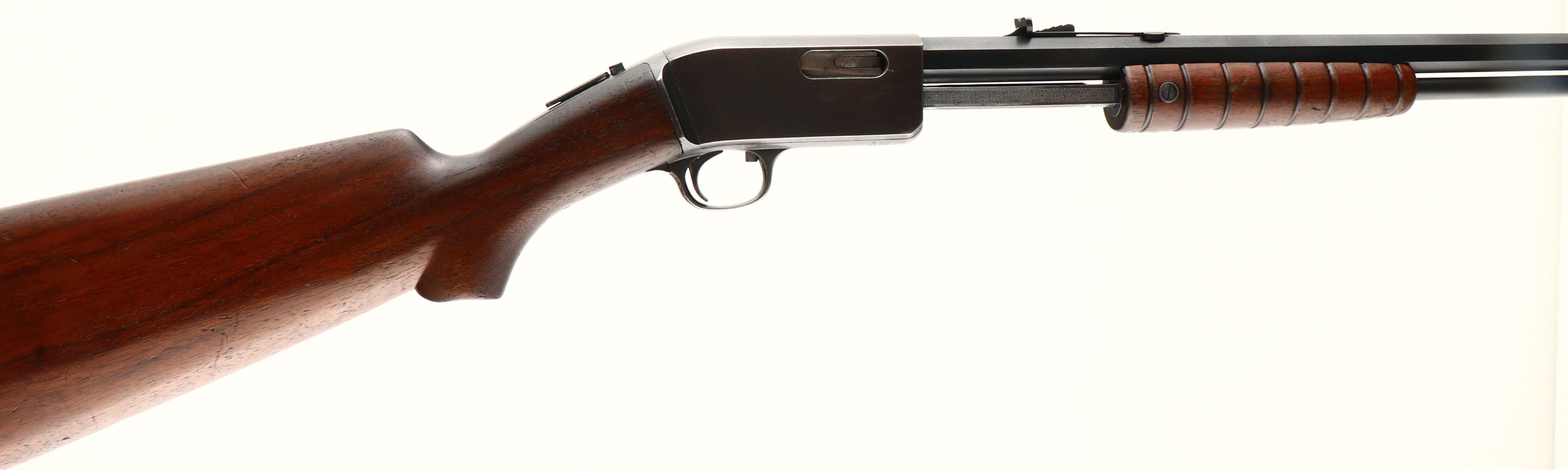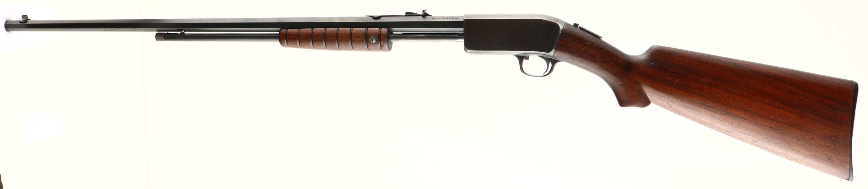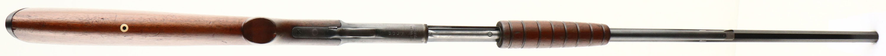 Marlin, Model 38, .22 S. L. & LR. Cal., MFG: 1921-30, SN: A822, Pump Rifle, 24'' Tapered octagon barrel, 2/3rd Tubular mag. Take-down. The original smooth pistol grip wood stocks are very good & solid. The is a 1 1/2'' long toe break glue repair to the stock & part of the stock has been lightly sanded & refinished long ago, probably at the time of the toe repair. The wood displays minor contusions & light scratches, with the overall appearance being very good. The Trademark bullseye insert is in the belly of the stock. The factory metal blue finish is retained at 90% on the barrel, 70% on the receiver & mag tube. Barrel is mounted with an adjustable rear & blade front sights. The rifle barrel has been re-lined. Bore is very good. The The stock carries a checkered Marlin logo buttplate. Rifle action function smooth & properly. A nice looking example. FFL or C&R Req. - Value: 300 to 600