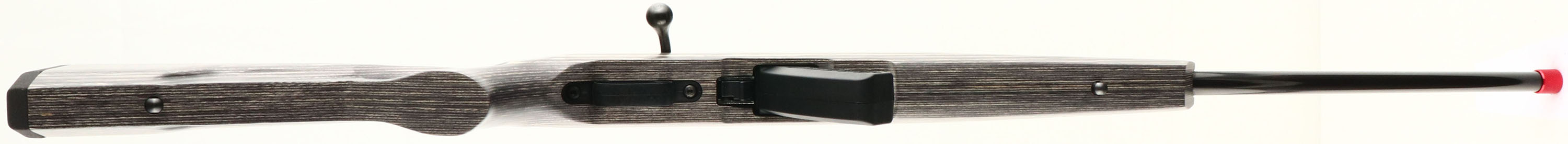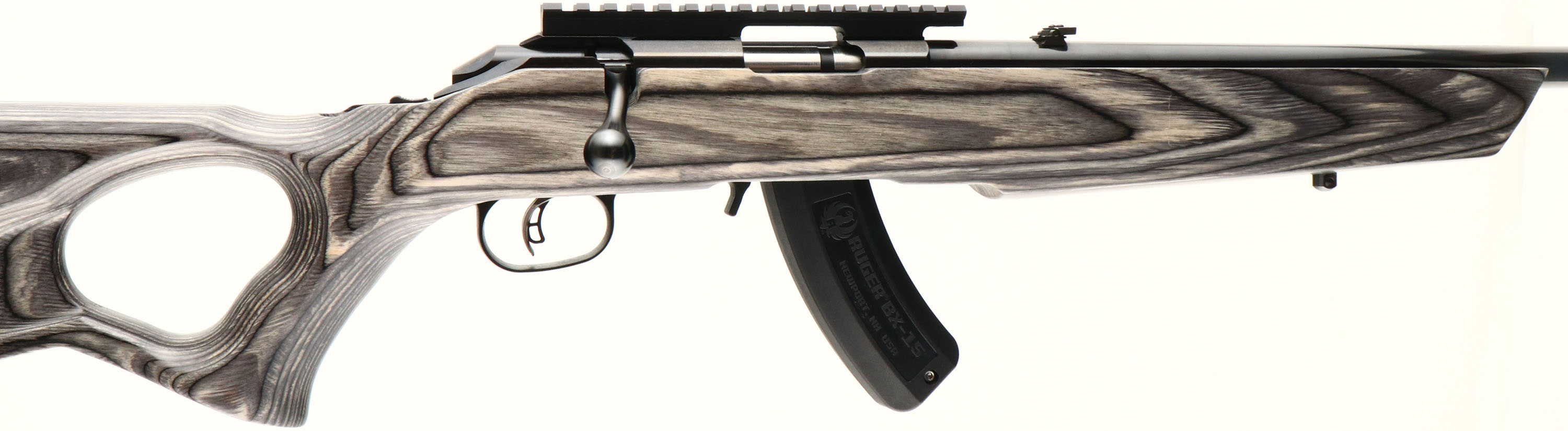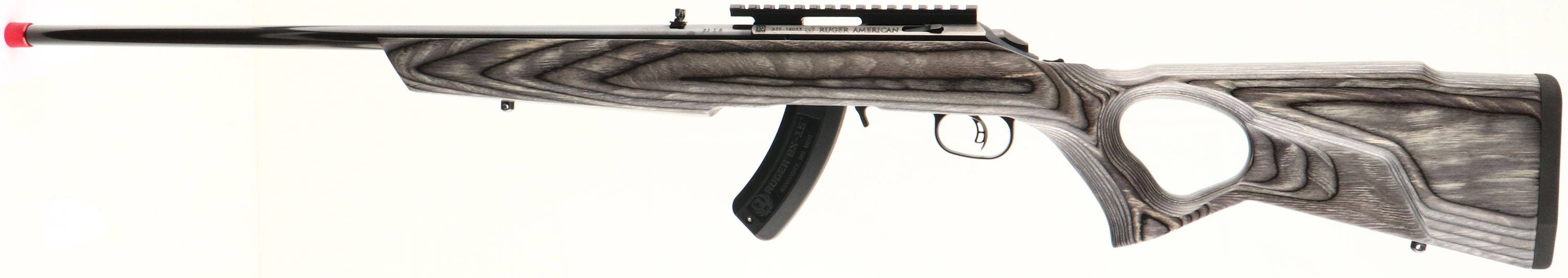 Ruger Model ''American'', CAL: .22 LR, MFG: Modern, SN: 8358-18053, Bolt Action Rifle, 22'' round tapered barrel, with threaded barrel tip. The thumb hole, pistol grip & upgraded Boyds gray & black laminated stock is excellent, with a few light surface blemishes to the original finish. The original metal black finishes are 98% overall. Bore is excellent. The receiver carries a picatinny rail, while the barrel carries a folding rear leaf sight. Black rubber recoil pad. Detachable Ruger BX-15 extended mag. Swing studs. FFL Req. - Value: 300 to 600