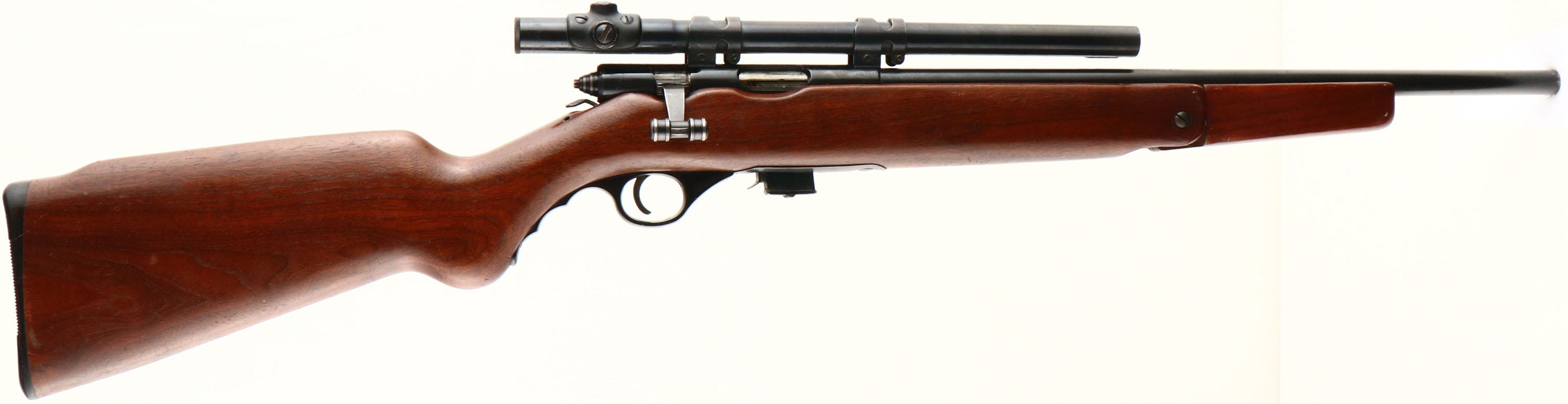 Mossberg, Model 142-A, CAL: 22 S,LR, MFG: 1949-57, SN: NONE, Bolt Action Carbine Length Rifle, 18 1/4'' barrel. The original round knob Monte Carlo stock style is excellent, This model has a unique fold-down foregrip, with this particular rifle having the very early wood version, as the later versions switched to plastic. The stock displays scrapes & contusions to the original finish. The metal blue finish rates 85% overall, with some additional wear on the floorplate. Bore is excellent. The receiver holds the original Mossberg No. M4d 4 Power scope, while the back left side of the receiver has two open holes from previous mounting of the receiver sight. The barrel has no open sights as the front sight has been removed. Stock carries a grooved plastic buttplate. Sling loops mounted on the left side of stock. Detachable 7 rd mag. FFL or C&R Req. - Value: 200 to 400