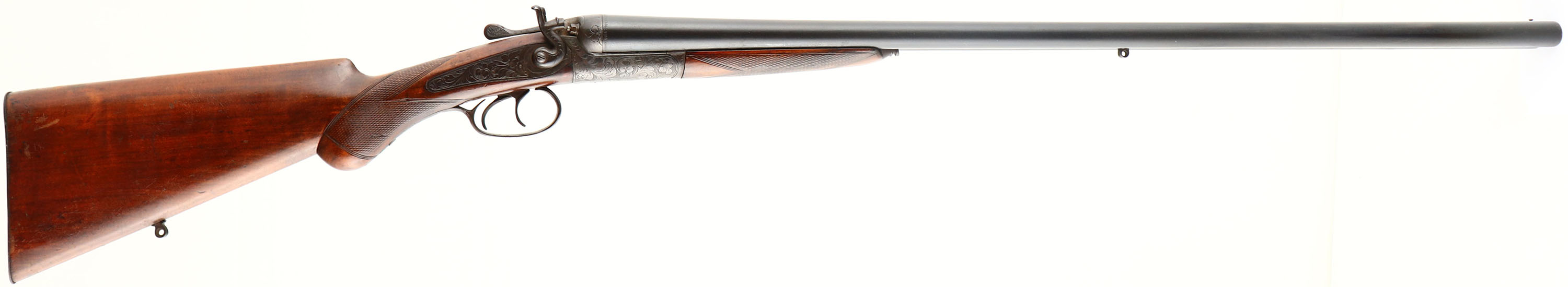 Belgium, SxS Shotgun, CAL: 12GA, MFG: N/A, SN: 13842, Break Action SxS, 29 5/8'' barrels. The original checkered & cheeked round knob wood stocks are excellent, having been lightly sanded & refinished at one time. There are smoothed contusions, dings & scrapes, with some areas of darkening from added finish. The metal blue finish on the barrels is a mix of original blue & brown patina, with consistent spotting throughout. The case-hardened receiver has fully toned to a smooth brown patina. Bores are excellent, with visible light wear from use. The solid matted rib holds a single front bead. Grooved metal buttplate. Double triggers. Sling stud in belly of stock & bottom barrel rib. Hammers both cock & triggers function. FFL & C&R Req. - Value: 200 to 400