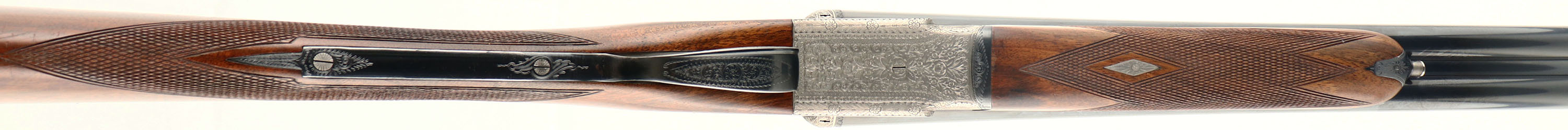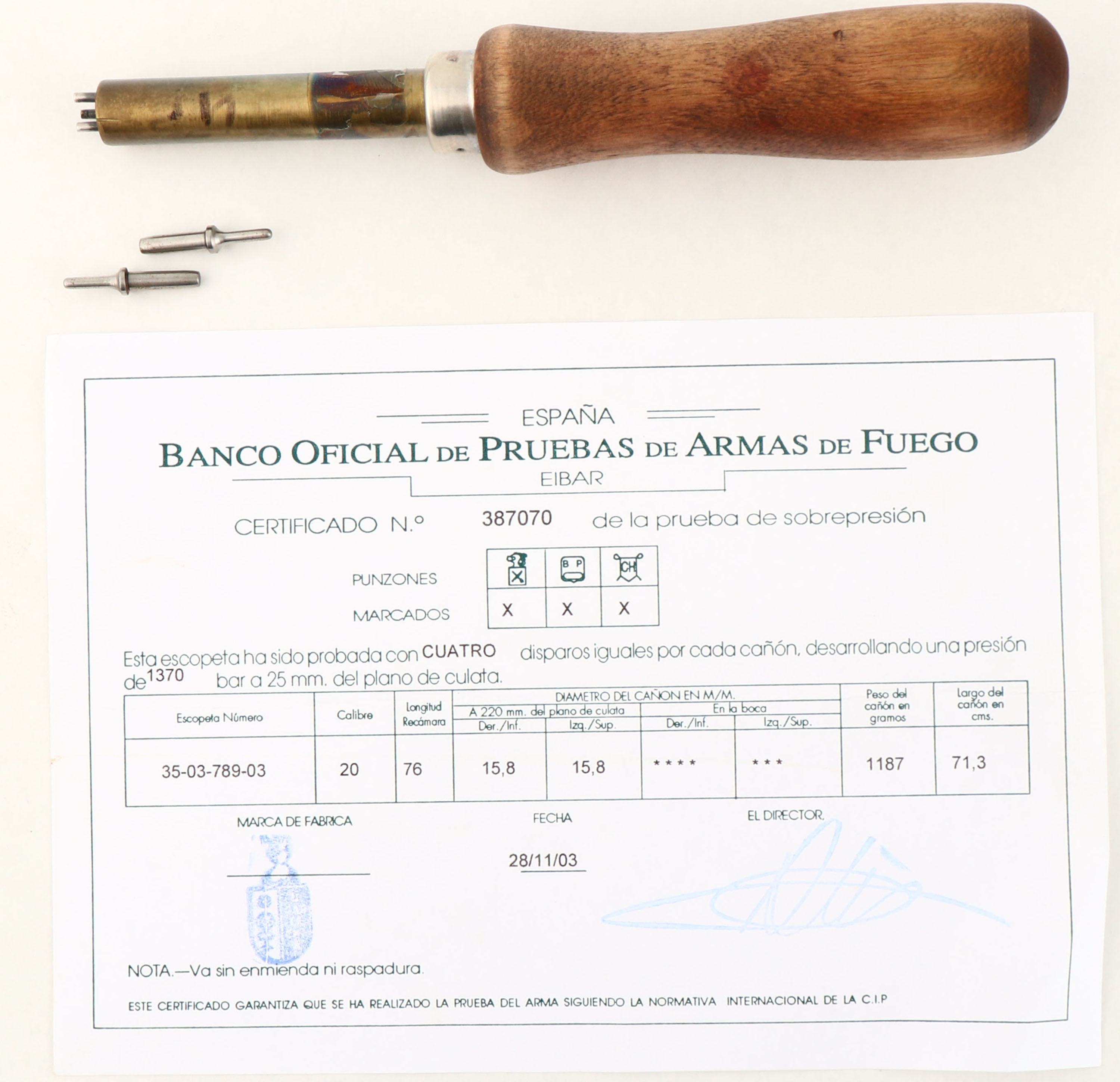 Ugartechea (Spain), Upland Classic, Grade V, CAL: 20GA, MFG: 2003, SN: 35-03-789-03, Break Action SxS Shotgun, 28'' barrels. The original checkered straight grip wood stocks are excellent. The hand applied oil finish is excellent. There are only minor handling marks & some light scrapes. The original metal blue finish on the barrels rates. 98%. The coin silver finish on the receiver is excellent. The receiver is fully engraved with intricate floral scroll work. The break lever, trigger guard, barrel ends, safety & forend metal components all display the same style engraving. Bores are excellent, with visible striations from use. The solid rib holds a single front bead. No buttplate. Comes with a custom 3-prong tool, to replace the firing pins. A beautiful example of a Spanish SxS shotgun, perfect for small upland game birds. FFL Req. - Value: 2500 to 4500