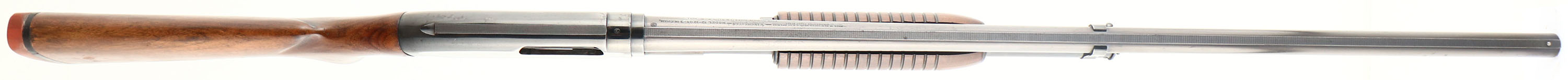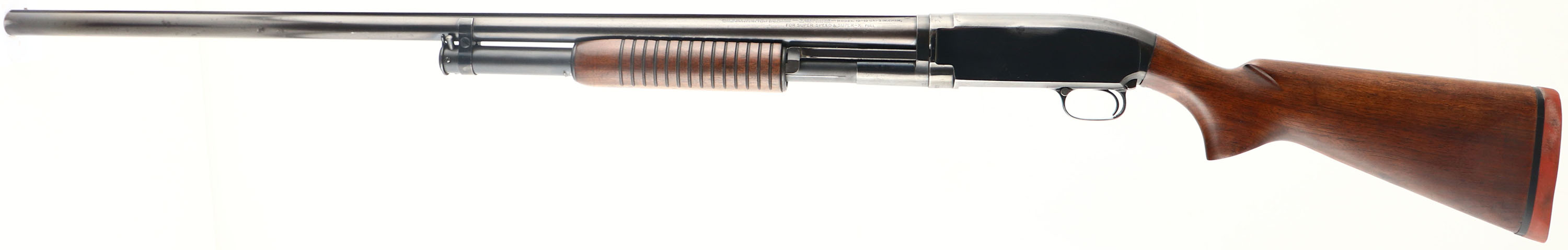 Winchester, Model 12 Duck Gun, CAL: 12 GA, MFG: 1950, SN: 1324252, Pump Action Shotgun, Choke: FULL, 3'' Chamber, 32'' Solid rib barrel. This gun has the barrel length, solid rib, chamber & choke of a typical ''Duck Gun''. The original flat pistol grip wood stocks are excellent, with the lower portion of the stock having been previously sanded in a couple of areas & nicely refinished. The forend appears to carry the original finish. There are very few minor blemishes to the wood, The original metal blue finish rates 75% overall, with thinning & spotty loss, & a couple of small areas of cleaned rust pitting on the left side of receiver. Bore is excellent. Silver single front bead on rib. Buttstock carries a Winchester solid red recoil pad, with 13 7/8'' LOP over pad. FFL or C&R Req. - Value: 600 to 1000