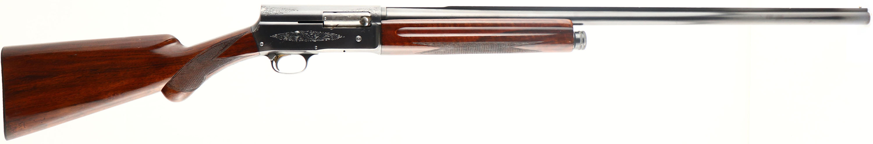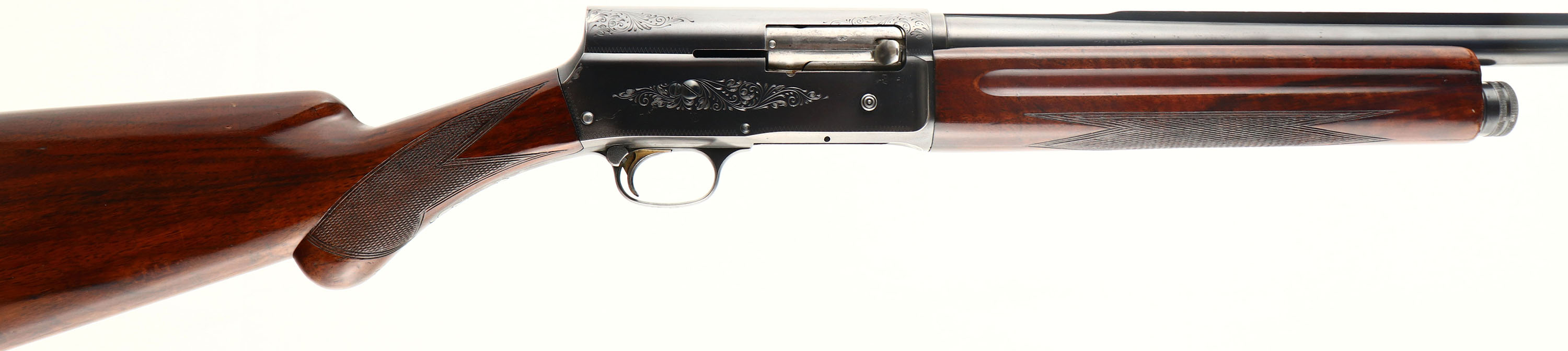 Browning, Model A5, SWEET SIXTEEN, CAL: 16 GA, MFG: 1956 (Belgium), SN: S71951, Semi-Auto Shotgun, Chamber: 2 3/4'', 27 1/2'' Matted solid rib barrel. The checkered & round knob pistol grip stocks are very nicely, having the remains of the original finish & an added coat of glossy finish. There are minor scratches, contusions & scrapes under the finish. There is a small patch of fill on each side of the toe, likely needed for a small toe repair. The checkering is very good. The original metal blue finish on the barrel rates 85% on barrel, 80% on receiver, with the majority of loss found on the belly of the receiver & the lower tang. Typical decorative hand engraving on receiver. Bore is excellent. The rib holds a single front bead. The buttstock carries the original FN Browning buttplate, LOP: 14 1/8''. Much of the gold wash on trigger is fading. The sweet-sixteen presents very well. FFL or C&R Req. - Value: 600 to 1000