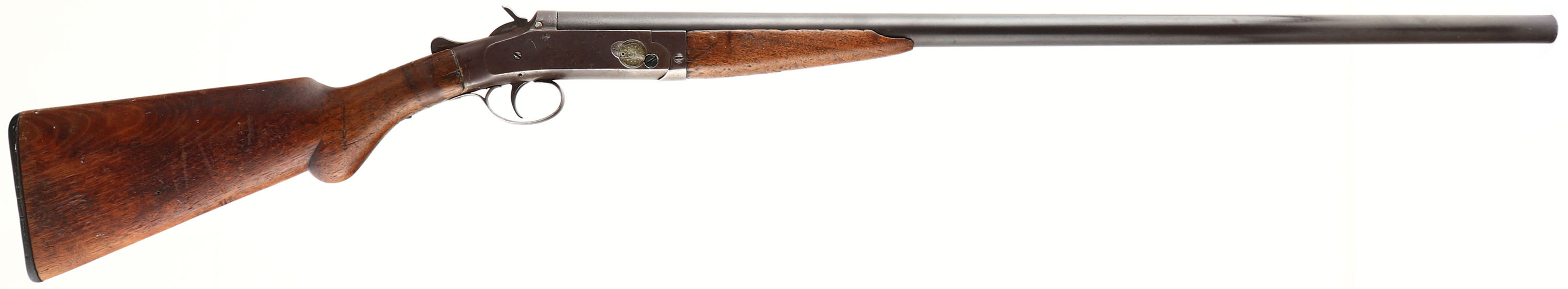 A. Baldwin & Co. Limited, Model Single Break Shotgun, CAL: 12 GA, MFG: circa 1900's, SN: None, CYL+, 30 1/2'' barrel. The original round knob wood stocks are fair, with several glued stress cracks & a chip at the wrist, There are edge chips on the forearm & numerous contusions, scrapes, nicks & scratches to the well worn original finish. The metal finish has worn & toned to a brown patina. There take-down pin & coin shaped take-down assist has been replaced with a new pin & actual coin. Bore is fair due to heavy use, but clean. No bead on barrel. Buttstock carries a worn black plastic buttplate. FFL or C&R Req. - Value: 50 to 150