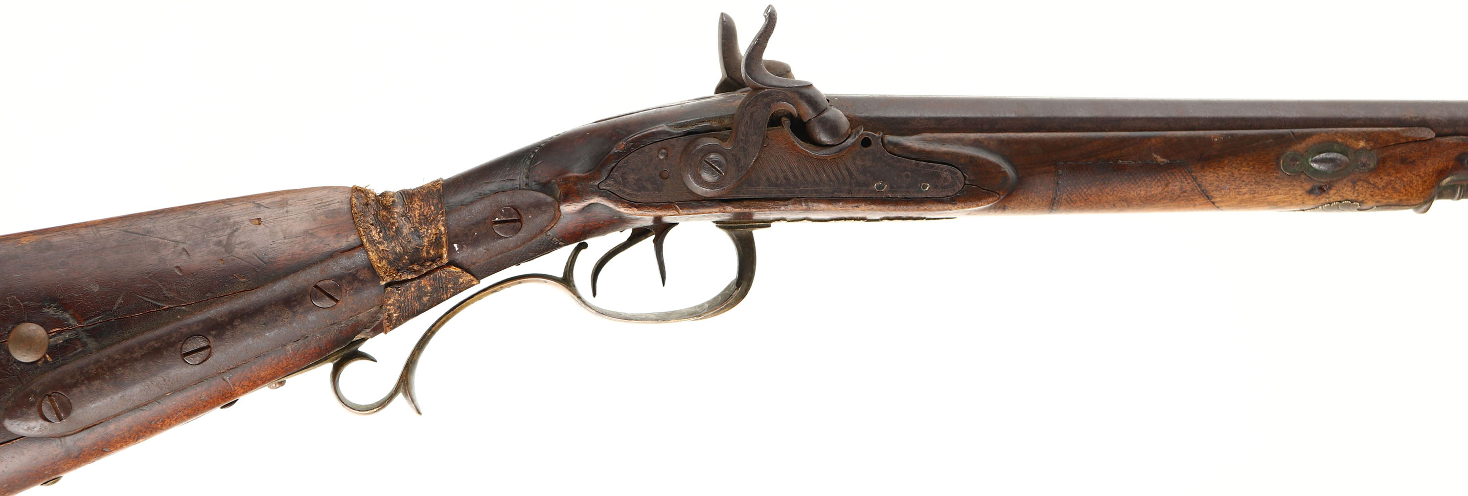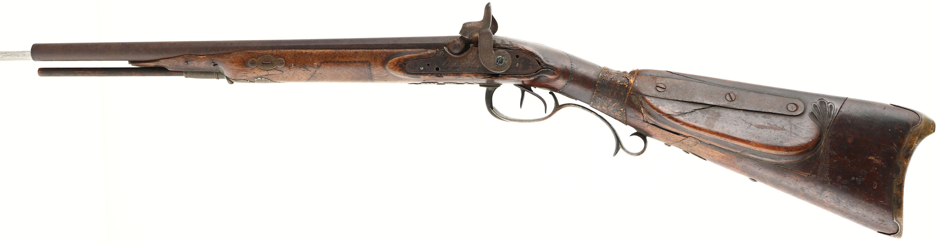 Tex-Mex Sawed off double barrel, originally made by Christian Schram of Offenbach, Hesse, Germany. Flintlock muzzleloader converted to percussion, .58 Cal (24 Ga), 16 3/4'' barrels. The stock is poor. Has many crack, chips & repairs from a long & hard life in the old west. Has ornamental brass fittings. Raw hide repair on wrist. Faint outline remains of checkering on the forend & wrist. metal has toned to a rust brown patina. The top of the barrel is marked ''CHRISTIAN SCHRAM'', ''OFFENBACH HESSE'' in German script. the marked is heavily worn/faded & is barely legible. Bottom of trigger guard is marked with a crossed cannons & arrow logo. The hammers, lockplate, lower & upper tangs have worn ornamental engravings. The bores are poor, both are dark with rust & pitting. No sights. Brass ornamental buttplate, toning dark with patina. Gun has ramrod. A great wall hanger with a lot of history, if only the gun could talk. Muzzleloader/Antique, No FFL Req. - Value: 100 to 500
