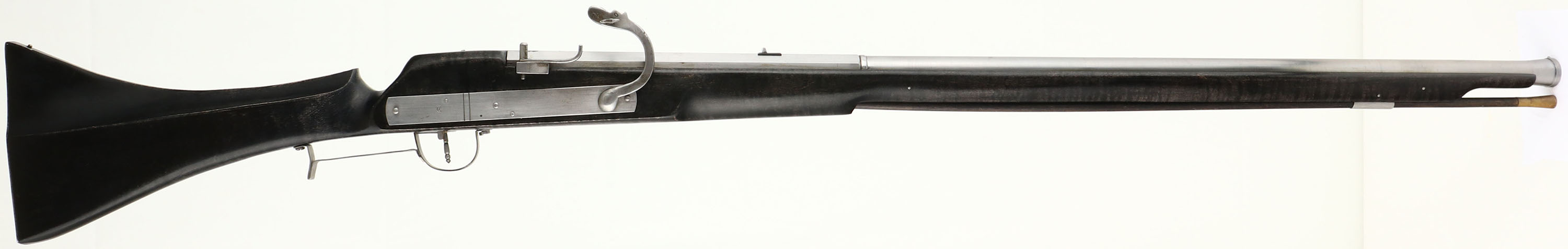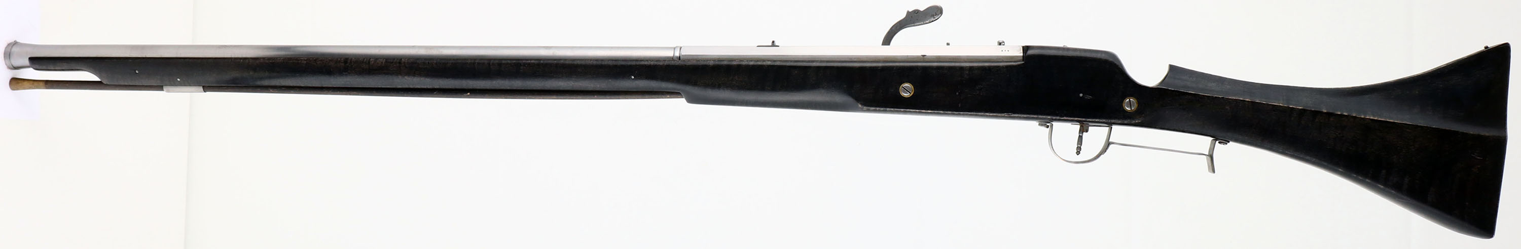 Augie Burgoon, Model 1606 Matchlock Rifle, CAL: 60 Smoothbore, MFG: 2008, SN: XIV, 36 7/8'' barrels. The ebony wood stock with integral thumb rest is excellent. There is some light edge wear to the finish around sharp corners. The barrel & frame have been polished & left in-the-white. There are visible buff lines, with a light area of spotting near the action. Bore is excellent & bright. Mechanical function is excellent. The barrel has a small fixed rear sight & small blade front sight. Augie Burgoon is a metal works teacher in a small college and made this as a personal project. Suggested load for this rifle is .60cal ball, with patch & 70-100gr 2Fg powder. Top of barrel flat is marked ''MDCVII'' & there is a quarter moon & ''XIV'' on the left barrel flat. Black powder, No FFL Req. - Value: 500 to 1000