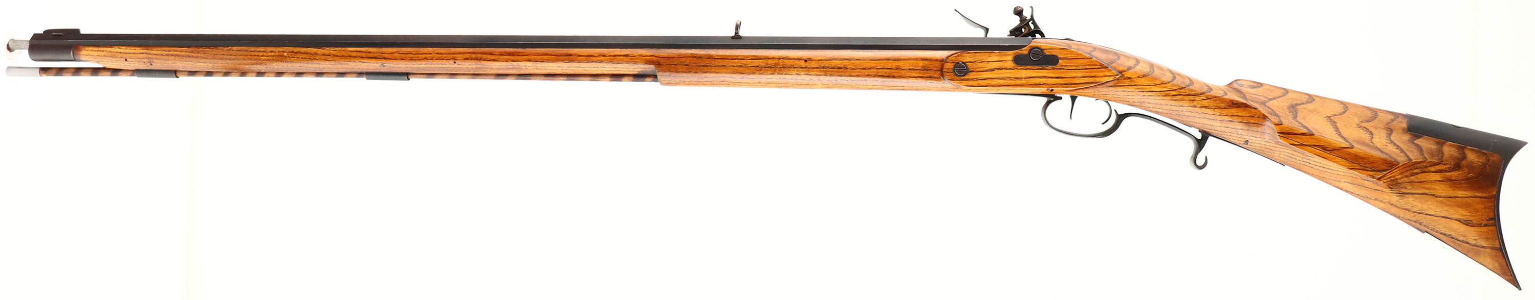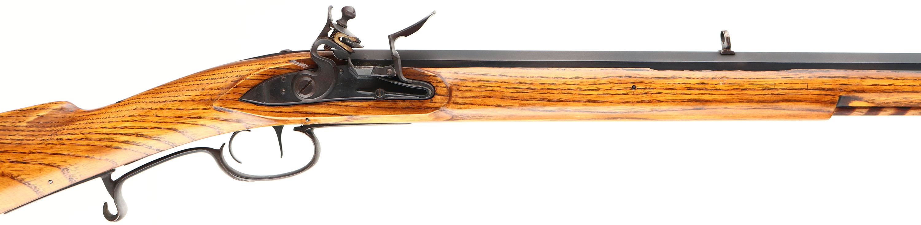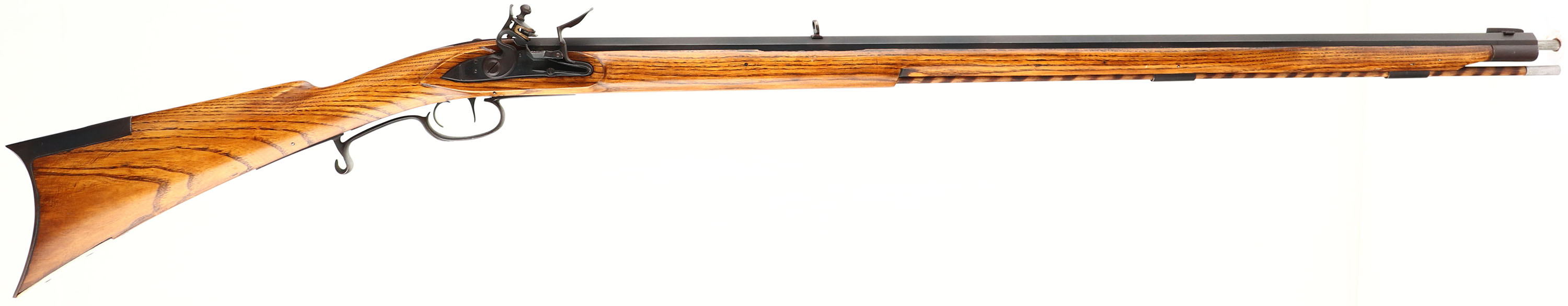 Unknown Maker, Commercial Reproduction Flintlock Rifle, CAL: 40, MFG: N/A, SN: NONE, Flintlock Muzzleloader Rifle, 34 1/4'' octagon barrel. The straight grip wood stock is excellent. There are minor scrapes to the finish. The original metal blue finish on the barrel has toned to a mix of original blue & brown patina. Rifled bore is excellent. Full buckhorn rear sight & blade front sight. Crescent metal buttplate with bone inlay at the toe. Double set trigger. A nice utilitarian flintlock muzzleloader. Black powder, No FFL Req. - Value: 300 to 600