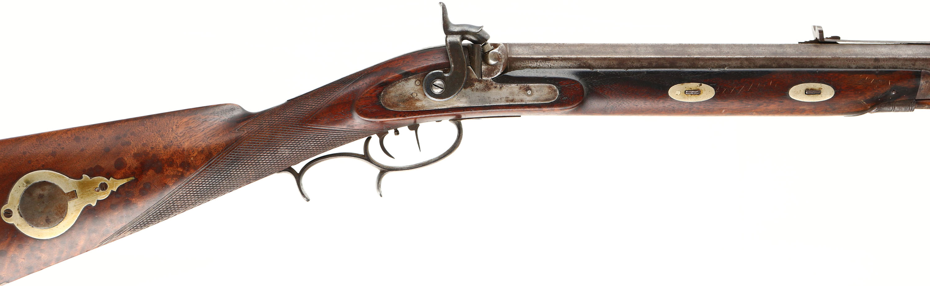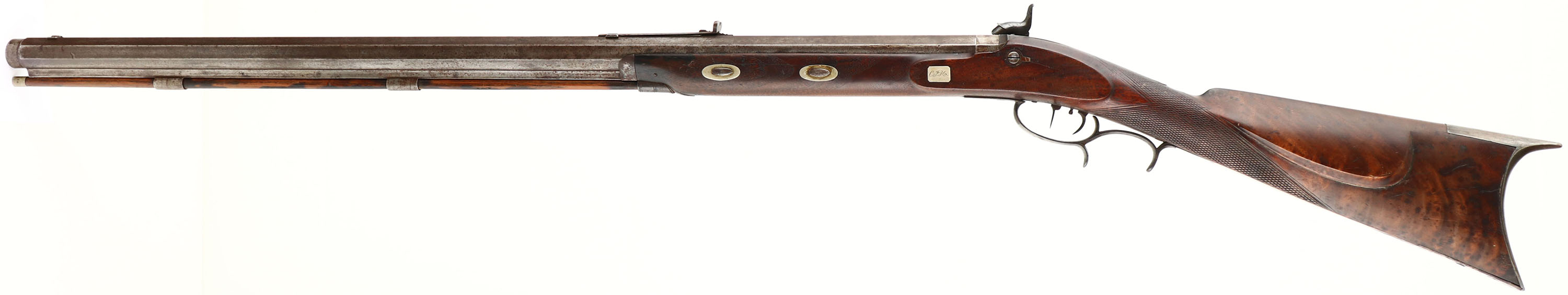 CONDITION: The checkered straight wrist, cheeked walnut stock is very good with three cracks on right side of stock, Infront of lock plate, & a few small cracks on left side of stock by side the plate screw. Spots of dark finish on buttstock & areas turned dark from added oils over the years. The wood has slightly shrunk over the years & the metal is slightly proud to the wood. Brass patch box in right cheek of stock. Iron furniture, German Silver Escutcheons for keyways on stock & cap of patch box. Silver medallion on left flat of stock stamped with the initials ''C.F.H.''. Barrel was left unfinished. All the metal has toned to a mixture of gun metal gray, brown patina, & light rust speckling. The upper tang & hammer have faint remains of case hardened finish in protected areas. The top of the barrel is marked ''J.BACH'', ''SAN FRANCISCO CAL''. The right side of the barrel is marked ''REMINGTON'', ''CAST STEEL'', this marking is worn/faded. The bore is very good. Its bright with a spot of light roughness/pitting. The front sight blade is missing, has the dovetail base still, barrel holds a deep V-notch, elevation adjustable rear sight. The stock carries a steel crescent moon buttplate, toning brown with patina. Rifle has ramrod. Double set trigger. A beautiful example of a antique, west coast Muzzleloader made by a esteemed gunsmith. Muzzleloader/Antique, No FFL Req. - Value: 1500 to 4000