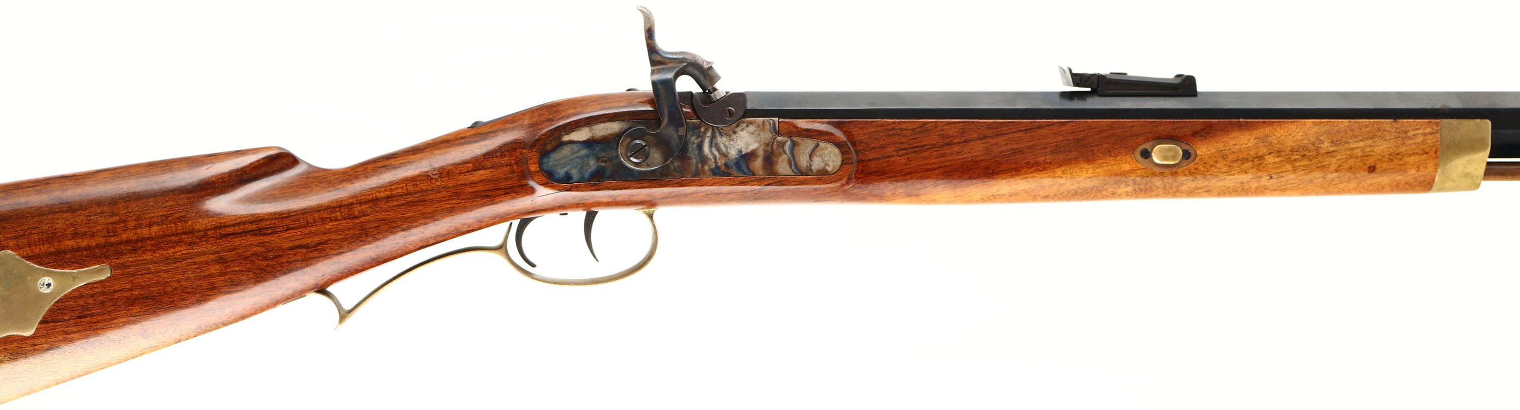 Armsport (Italian), Model: Hawken (unmarked), Cal: .50, MFG: modern, S/N: 11913, Percussion Muzzleloader, 29'' octagon barrel. The straight wrist, cheeked wood stock is excellent with a few minor nicks & scratches. brass patch box in right cheek of stock, has replacement percussion nipple, & brass cleaning jag inside. The blued metal finish on the barrel rates 92% with spots of light wear & light patina speckling, concentrated at the right side of muzzle. Case hardened finish remains on the lock plate & hammer, with small spots of wear & speckled patina. The bore is excellent. Its bright with little to no wear. The barrel hods a beaded blade front sight with a adjustable U-notch rear. Stock carries a brass crescent moon buttplate. Rifle has ramrod. Double set trigger. Muzzleloader, No FFL Req. - Value: 300 to 500