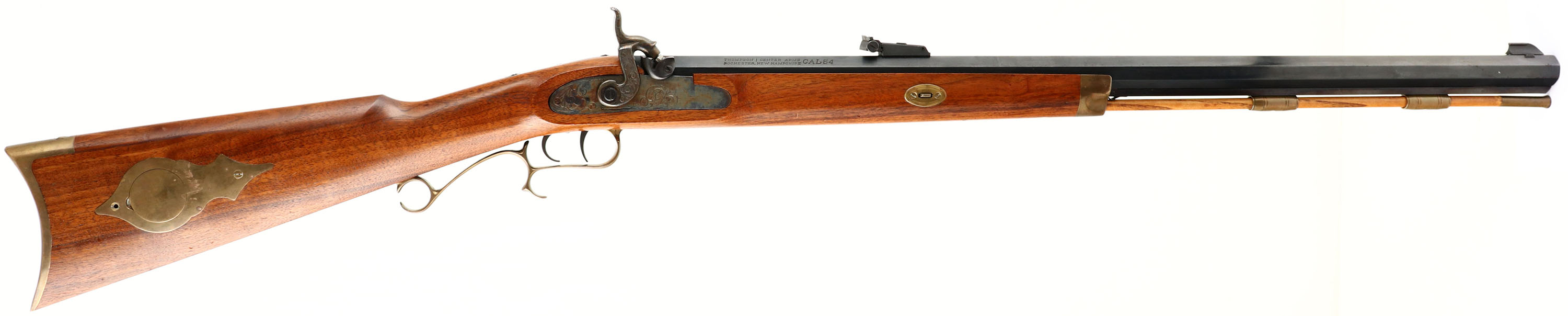 Thompson Center Arms, Model: Hawken (unmarked), Cal: .54, MFG: modern, S/N: K229642, Percussion muzzleloader, 28 7/8'' octagon barrel. The straight wrist, cheeked stock is excellent with a few minor nicks & scratches. has brass patch box in right cheek of stock. The blued finish on the barrel rates 97% with spots of light wear & light patina speckling. Lock plate & hammer retain almost full case hardened finish. The bore is excellent. Its bright with little to no wear. The barrel holds a beaded blade front sight with a adjustable U-notch rear. The stock carries a brass crescent moon buttplate. Rifle has ramrod. Double set trigger. Muzzleloader No FFL Req. - Value: 300 to 500