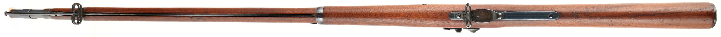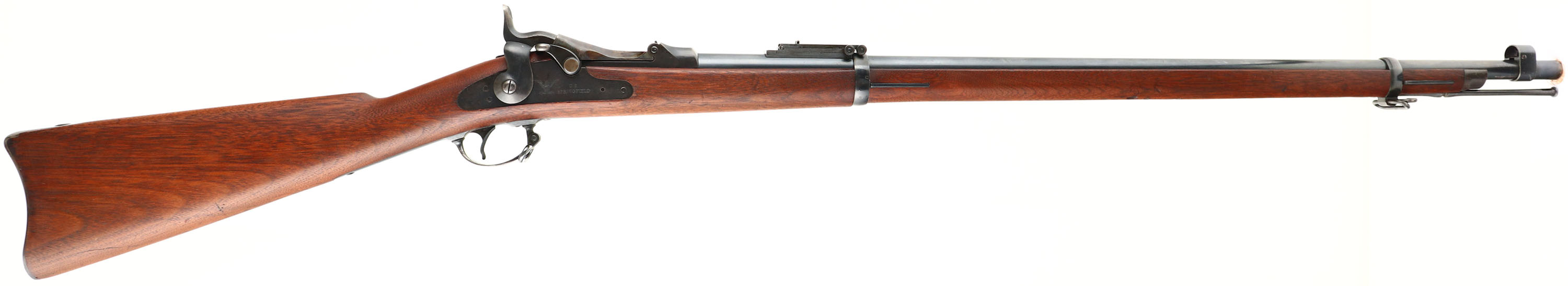 Springfield Armory, Model: 1884 Trapdoor (1873 marked breech), Cal: .45-70, MFG: 1887, S/N: 346806, single shot rifle, 32 '' barrel. The straight wrist walnut stock is excellent with only small minor nicks, dings, & scratches. Left side of wrist has a ''SWP'', ''1886'' in box cartouche. The belly of the stock is marked with the circle ''P'' proof cartouche. The blued metal finish on the barrel rates 90% with concentrated wear at the muzzle. The case-hardened finish on the breech block rates 90% with light wear & patina speckling. The top of the breech block is marked ''US'', ''MODEL'', ''1873''. Springfield would use up old 1873 marked breech blocks on the new 1884 Model. 1884 marked breech blocks would start coming out mid to late 1887. The rear of the receiver is marked with the S/N. the left side of the barrel is marked ''V'', ''P'', over eagles head, ''R'', ''P''. the top of the barrel is marked ''A''. the lock plate is marked with the American great eagle, ''U.S.'' ''SPRINGFIELD''. The bore is excellent. Its bright with very little wear. The barrel holds a blade front sight with protective hood, & a Buffington ladder rear sight. The stock carries a blued steel buttplate, has wear & small spots of patina. Rifle has both sling loops & the third stacking swivel. Rifle also has cleaning/clearing rod. A beautiful, high condition trapdoor Springfield. Antique, no FFL Req. - Value: 1000 to 2000