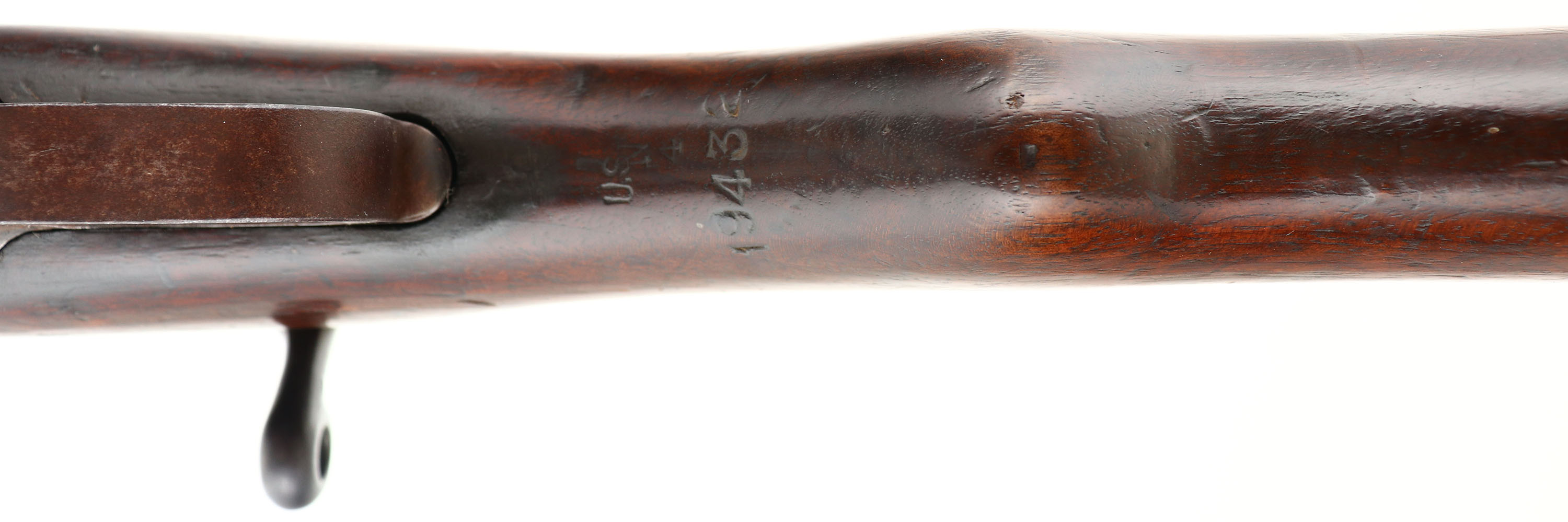 HISTORY: The Ross rifle has a long & very interesting story. this rifle is just a small part of that. In 1917 the US was sending troops to the front lines to fight. They wanted everyone sent overseas to be armed with the same gun, or at the very least the same caliber. But the US was having problems scaling up its M1903 production for its growing army; so, stop gaps had to be made until it could catch up or another solution could be found. The US would use older obsolete rifles for home guard troops, or for training, where keeping them repaired & supplied with ammo was much easier than on the other side of the world. Leaving more of the standard arms for front line use. 20,000 ross Rifle MK.II 3 stars were bought for training rifles. They were marked with a Flaming bomb & US on the bottom of the wrist.