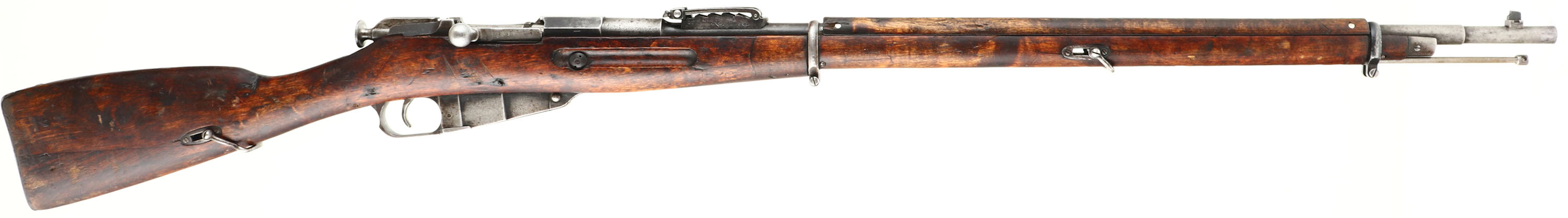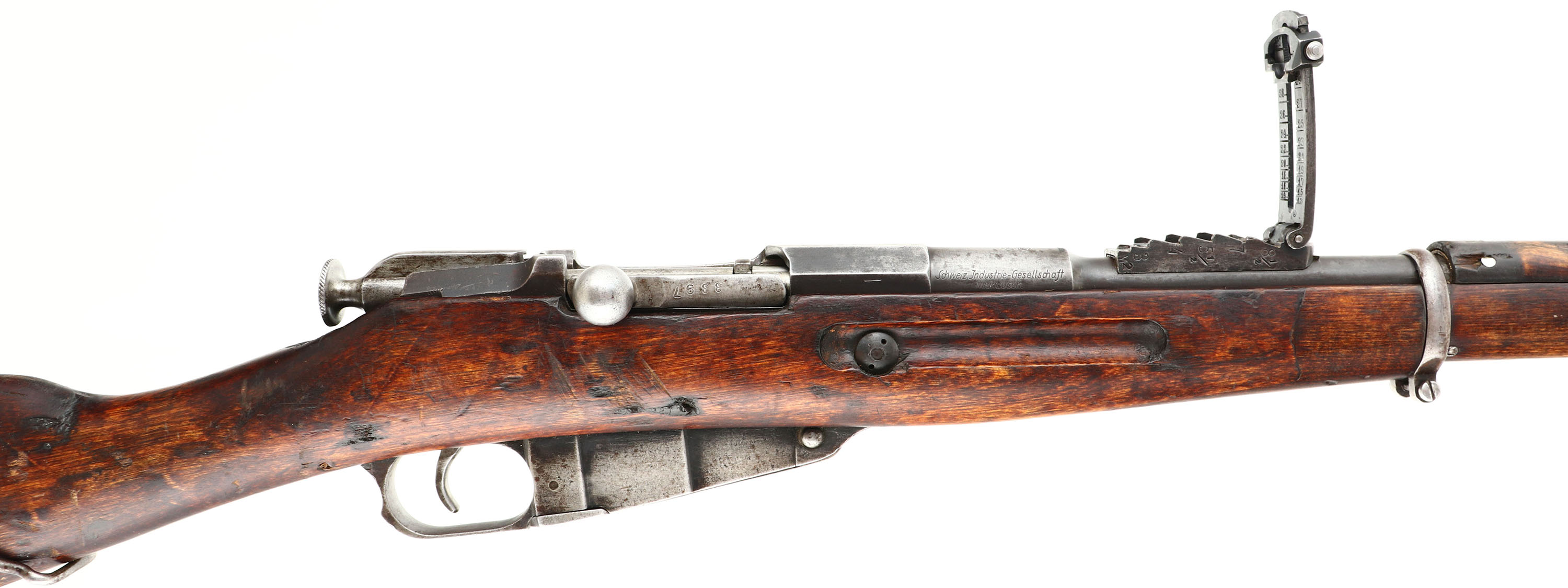 CONDITION: The straight wrist, artic birch stock is very good with nicks, dings, chips, scuffs, & wear from use/age. Small chips by the rear rivets on the upper handguard. Stock has a toe replacement, either done when it was refurbished into a M24, or later arsenal repair. Has the period correct rounded finger splice joints. The metal is mostly worn gray with areas toned brown on the receiver & brown patina speckling. The left side of the receiver is marked with the S/N. the top of the receiver band is marked with a half faded M, a buffed/worn Imperial Russian eagle, & the lined-out number 24482. Left side of the barrel is marked with the S/N, & the SA in box, Finnish army property mark. Top of the barrel is marked with the Civil Guard crest of an S topped with three fir sprigs in a shield. The right side of the barrel is marked Schweiz-Industrie Gesellschaft, Neuhausen. The bottom of the receiver tang is marked with a very faint Tula hammer, no mfg. mark visible. Has a S/N forced matched bolt; all bolt parts marked with Izhevsk stamps. Other parts are of mix of MFGs, very common on Finnish Mosins. The bore is good. Its bright with constant light roughness throughout & lightly thinned rifling. Has been counter bored. The barrel holds a notched barleycorn front sight with a Konovalov V-notch rear sight. The arshins sight markings on the left side of the base have been crossed out, with new sight markings in meters on the right side, also a 200-meter notch was added to the base by the fins. This sight marking change Is seen on practically all Finnish Mosins. The stock carries a steel buttplate, worn gray. Stock has the Russian sling wells with Finnish sling bars. Rifle has a cleaning rod. A good example of a well-worn/used, but still perfectly functional Finn Mosin. FFL or C&R Req - Value: 500 to 1000