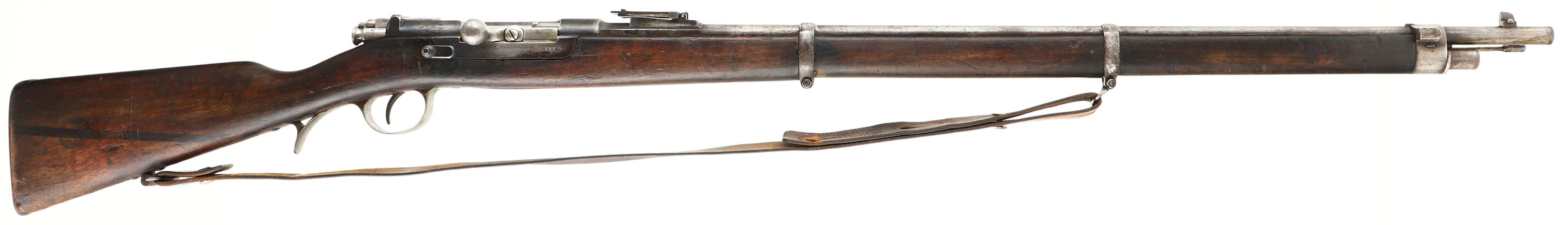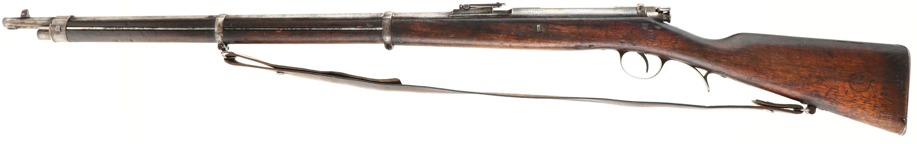 CONDITION: The straight wrist wood stock is good. Stock has nicks, dings, dents, scratches & wear from use/age. Stock has darkened from added oils over the years. Bottom of the stock has a 3 crack emanating from the trigger guard. Wood has shrunk around toe & buttplate is proud to wood. Right cheek of stock is marked with the monarchs cypher roundel, it would read with the model number (M1886) over the MFG & date of MFG (STEYR 1886), with ''OE.W.G.'' in the middle. Marking is worn & is illegible but is still visible. Left cheek is marked with a faded large round cartouche & the S/N ''BB81''. The trigger guard extends out to a pistol grip style finger rest. The metal has mostly worn gray with spots of thinned finish in protected areas, & speckling of brown patina. There is rust & pitting around the stock line. The left side of the receiver is marked ''OE.W.F.G. STEYR'', ''1886'', Crown over a banner over ''L.I'', ''M.1886''. the right side of the receiver & barrel are marked with the S/N. the top of the barrel is marked with a small crown proof. S/N mismatched bolt, the components are also a mix of S/Ns. the bore is very good. Its bright with spots of light roughness. The barrel holds a barleycorn front sight with a flip up ladder, V-notch rear sight marked 6 to 22. The stock carries a steel buttplate, toned brown with roughness. Rifle has both slings loops, cleaning rod, & comes with a brown leather sling marked ''J.BUROY'', ''SELLIER'', ''CUGY''. Antique, no FFL Req. - Value: 350 to 700