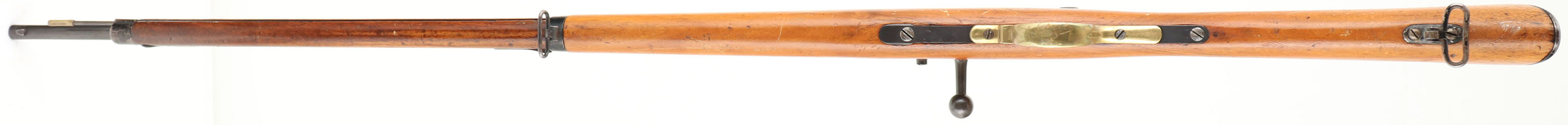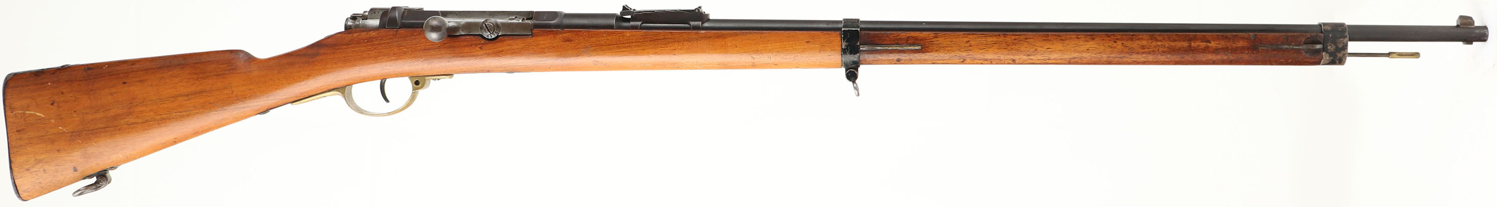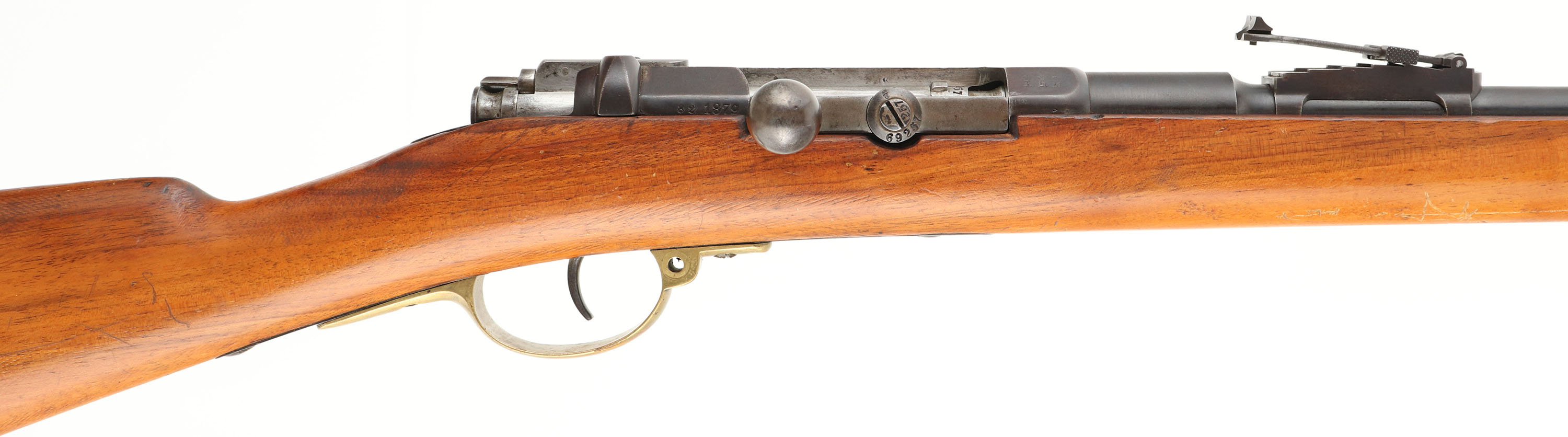 HISTORY: The story of this rifle starts with Antonio Dovitiis, he was a Italian tailor and merchant of military supplies in Montevideo, who wound up with the job of procuring some new arms for the Uruguayan military. He got a bunch of single shot 11mm Mauser 1871 rifles, obsolescent by the 1890s. In 1895 he made a deal with the St. Denis arsenal in France to re-barreled 10,000 Mauser 71 rifles to the new French 6.5mm Daudeteau Cartridge, a high velocity smallbore, smokeless round. When they were made they were switched from rifles to carbines, carbines to rifles, & no rematching of parts made, making most of them having mixed parts. When Uruguay received these rifles they were not too please & wasn't really what they were looking for. They were quickly scrapped & Uruguay made some room in their budget & bought new M1895 pattern Mausers. A unique rifle with a mix of German & French markings for the Uruguay army.