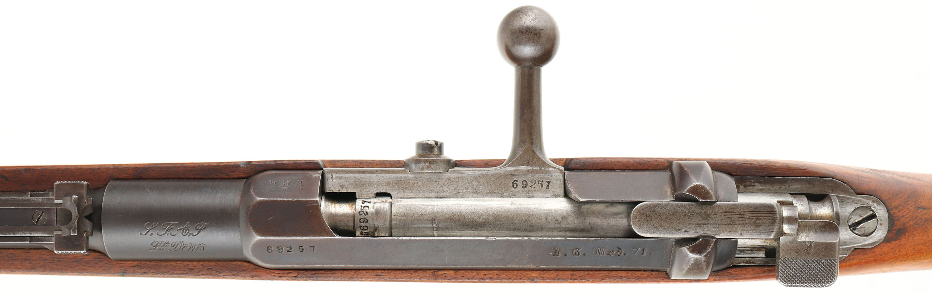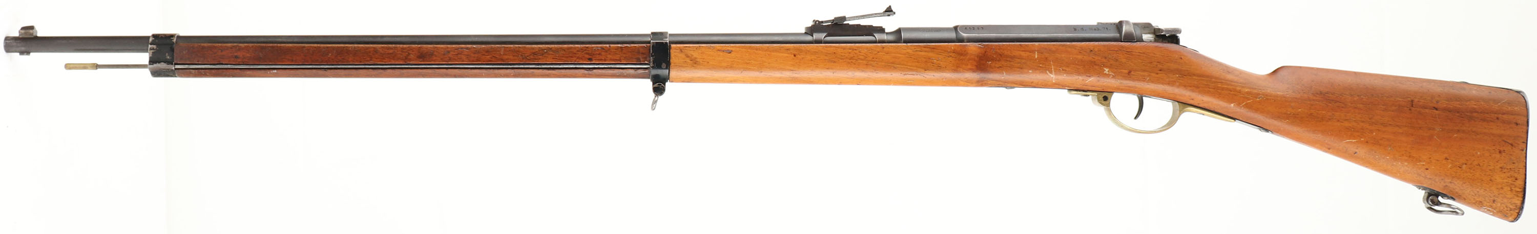 CONDITION: the straight wrist wood stock is very good with various nicks, dings, & scratches from use. The blued metal finish on the barrel rates 90% with some light thinning & wear. The blued metal finish on the receiver rates 80% with spots of thinning & brown patina. The left side of the receiver is marked with the S/N, ''I.G. MOD. 71''. The right side of the receiver is marked with three thinned imperial German proofs, ''1879'', ''82''. The ''82'' mark means this rifle was sent to a arsenal & re-worked/updated in 1882. the top of the barrel is marked ''L.F.t.P'', ''St. Denis''. S/N matching bolt, Extremely rare to find on these rifles. S/N mismatched screws. The bore is excellent. Bright with strong rifling & little to no visible roughness. The barrel holds a barleycorn front sight with a stepped base/ladder V-notch rear sight. Base marked 4 to 8, ladder marked 9 to 20. the stock carries a steel buttplate, has worn black paint finish. Has bolt sling loops & cleaning rod. Rifle also comes with a RARE M1886 Lebel bayonet converted to fit on the 6.5mm M1871/94. likely done by St. Denis since they were making this style of bayonet for the French government. Antique, no FFL Req. - Value: 600 to 3000
