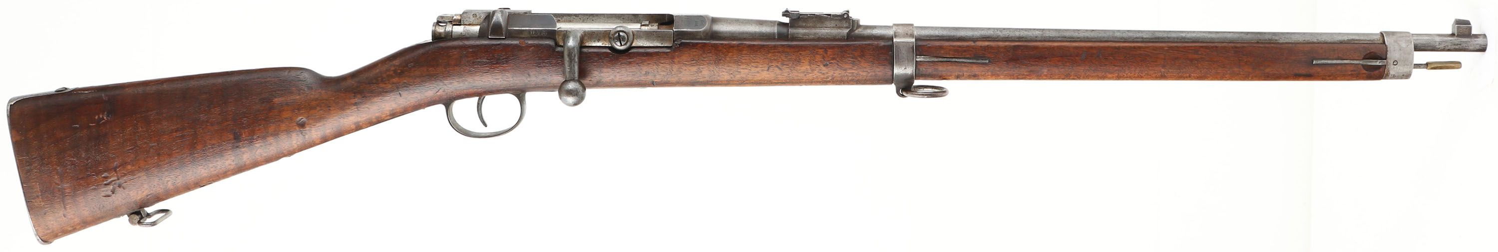 CONDITION: the straight wrist wood stock is very good with nicks, dings, dents, scratches & wear from use/age. Metal is proud to the wood in one spot on the lower tang & on the toe. The metal has mostly worn gray with areas toning brown. Chamber areas has spots of rust. The left side of the receiver is marked with the S/N, ''K.Mod.71.''. Right side of the receiver is marked with three imperial German proofs, ''1879''. The top of the barrel is marked ''L.F.t.P'', ''St. Denis''. S/N matching bolt, all other parts are mismatched. The bore is very good. Its bright with strong rifling with small spots of roughness. The barrel holds a barleycorn front sight with a stepped base/ladder V-notch rear sight. Base marked 2 to 10, ladder marked 12 to 20. The stock carries a bare steel buttplate, has brown patina speckling. Rifle has bottom sling loop & forward sling ring. Rifle has cleaning rod. A nice handy carbine with a unique story & interesting markings. Antique no FFL Req. - Value: 600 to 2000