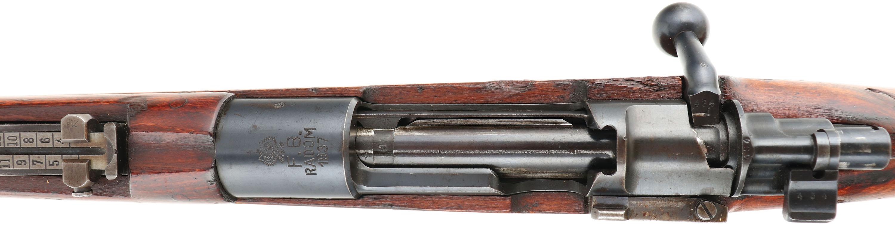 F.B. Radom (Polish), Model: kbk wz.29, Cal: 7.92x57mm (8mm Mauser), MFG: 1937, S/N: 53795P, bolt action rifle, 24'' barrel. The semi-pistol grip wood stock is very good with nicks, scratches, dings, grain pops & arsenal repairs. The right cheek of the stock is marked with a faint cartouche. The front of the semi-pistol grip is marked with two circle proofs & a Polish eagle proof. The belly of the stock has a worn & faint S/N stamp. The belly of the stock behind the rear sling swivel is marked ''19''. The blued finish on the barrel & receiver rates 90% with areas of light thinning, scratches, & brown patina. The left side of the receiver is marked with the S/N, ''wz.29''. The top of the receiver band is marked with a large Polish eagle, ''F.B.'', ''RADOM'', ''1937'', & a smaller Polish eagle proof near the right side. The rear sight & buttplate are S/N matched. The bolt appears to be out of a German K98k, has mismatched S/N with a German block letter (434 i), has German Waffenamt on bolt body/parts, & a small German eagle on the bolt handle. The bore is excellent. Bright & mirror like with minor roughness in a few spots. The barrel holds a barleycorn front sight with protective ears, & a tangent V-notch rear sight marked 3 to 20 on the top of ladder, & 3 to 20 on the bottom of ladder. The stock carries a blued steel buttplate with finish wear on top & bottom of plate. Rifle has cleaning rod. Has both side & bottom sling mounts. Firing pin disassembly disk in stock. FFL or C&R Req.