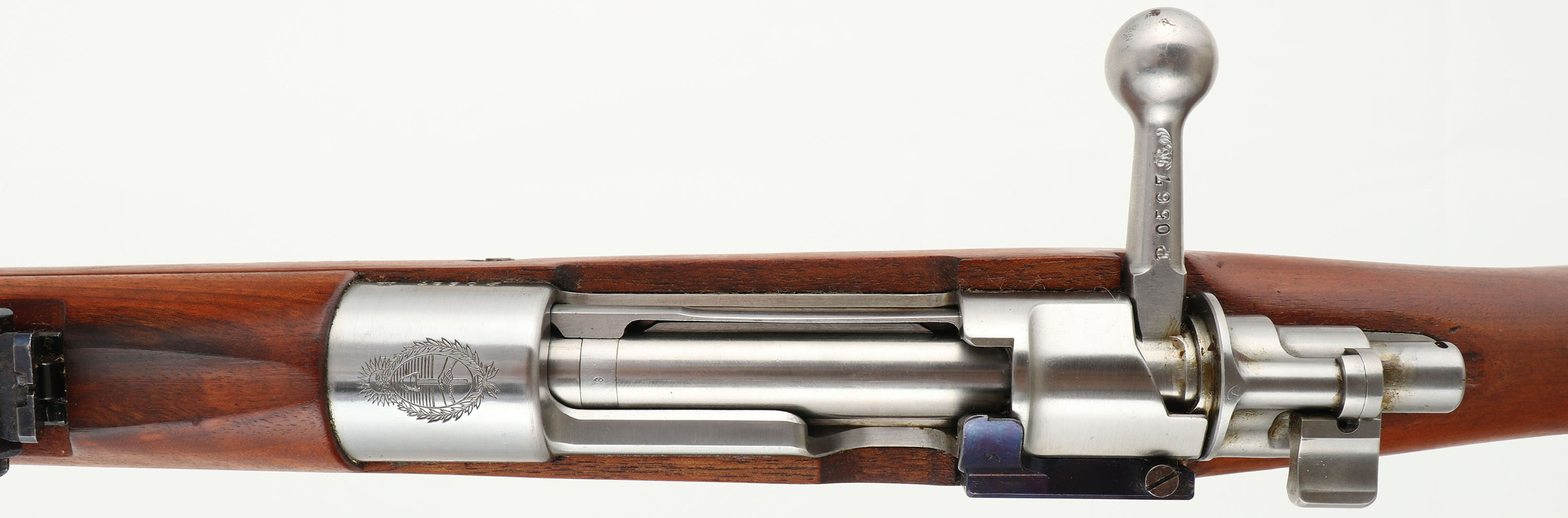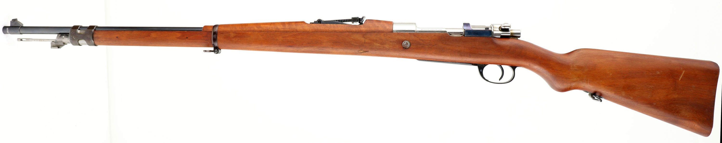 DWM, Model Argentino 1909 Mauser, Cal: 7.65x53mm Argentine, MFG: 1912, S/N: P0567, Bolt action rifle, 29 1/2'' barrel. The semi-pistol grip wood stock is very good, near excellent with a few dings & scratches. There are cartouches on the right cheek & belly of the stock, all are crisp & legible. The S/N is stamped into the right side of the stock, in front of the recoil lug. Upper handguard is marked with a sun over ''RA'' in a circle cartouche. With the condition the stock is in, it is likely a replacement stock from a arsenal. The stock was forced matched to the rifle when it was taken out of service, refurbished & put into storage. The blued metal finish on the barrel rates 96%, this was likely re-blued by the arsenal when it was refurbished. The receiver was left in the white (unfinished) from the factory. Left side of receiver is marked ''MAUSER MODELO'', ''ARGENTINO 1909'', ''DEUTSCHE WAFFEN-UND'', ''MUNITIONSABRIKEN.BERLIN'', top of receiver is marked with the Argentina coat of arms, right side of receiver is marked with S/N & a inspector mark. S/N matching Bolt. The bore is excellent. Bright & mirror like with little to no visible wear. The barrel holds a barleycorn front sight with a tangent V-notch rear sight marked 3 to 20. the stock carries a bare steel buttplate. Rifle has both bottom sling swivels, & has a S/N matching cleaning rod. The ''P'' serial block was the last block of 10,000 Rifle made by DWM. A excellent example of a Arsenal refurbished Argentine Mauser. FFL or C&R Req. - Value: 300 to 600