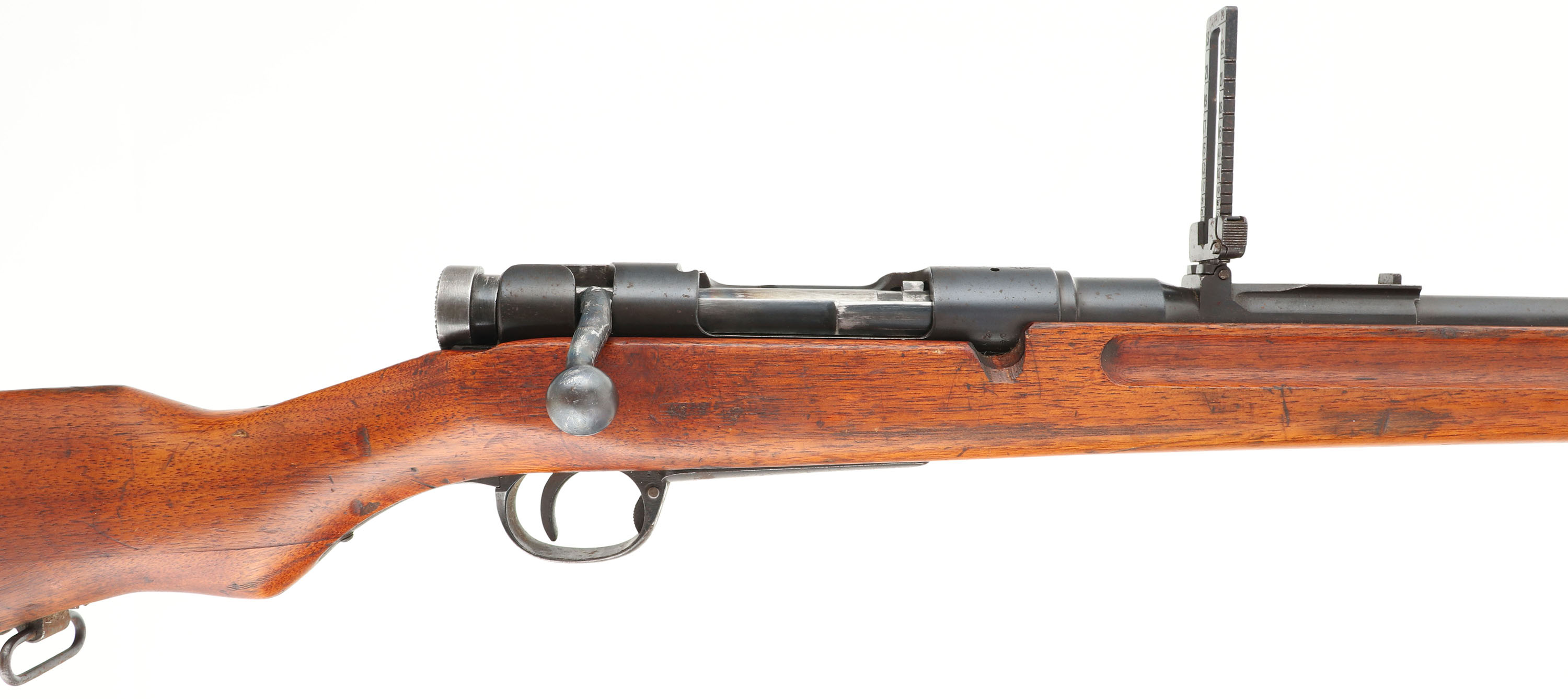 Tokyo Arsneal, Type 38, Cal: 6.5x50mmR, MFG: 1906-20's, S/N: 1205259, Bolt action rifle, 25'' barrel. The semi-pistol grip Japanese walnut stock is very good as being cut down, lightly sanded & oiled. The belly of the stock is marked with three Japanese character cartouches. The blued metal finish rates 85% overall with spots of thinning & rust speckling. The left side of the receiver is marked with the S/N, Tokyo Arsenal logo, & two small inspector stamps. The top of the receiver band is marked with a fully intact chrysanthemum, & ''TYPE 38'' in Japanese characters. The rear receiver bridge is marked with a small triangle in circle stamp & a small circle stamp. The left side of the barrel is marked with a small triangle in circle stamp, & ''S''. The bolt handle has grind & weld marks & has been bent down crudely. The bolt handle hits the stock before fully locking into battery & will not fire, the stock either needs shaved, or bolt handle needs fixed. The bore is very good. Its bright with strong rifling, but has light roughness. The barrel holds a barleycorn front sight with a flip up ladder V-notch rear sight marked 6 to 24. the stock carries a blued steel buttplate, has spots of rust. Rifle has rear sling swivel. FFL or C&R Req. - Value: 100 to 200