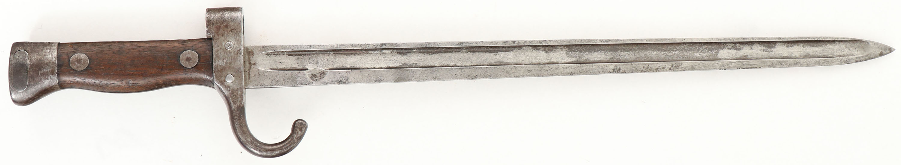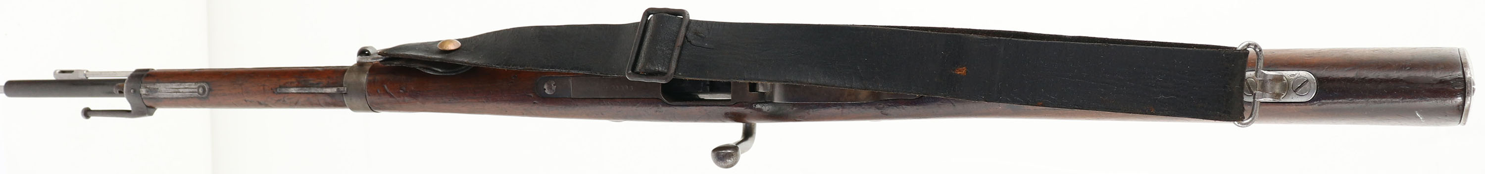 CONDITION: the straight wrist wood stock is very good with small nicks, dings, & scratches from use/wear. 1'' x 1 1/2'' inlaid wood stock repair on left side of forend,. The S/N is stamped into the left cheek of the stock. The right cheek is marked with the acceptance roundel that reads ''MARCH'', ''1917'', ''J.C.'', ''MA''. The blued metal finish rates 75% overall with areas of thinning/wear & spots of brown patina. The left side of the receiver is marked ''CHATELLERAUT'', ''MLE 1892'', ''MD''. The left side of the barrel is marked ''AB'', ''J'' in circle, ''C'' in circle, & the S/N. the rear extension of the trigger guard is marked ''CW'' in a circle. The right side of the barrel is marked ''MA C 1917''. S/N matching bolt & magazine. The bore is good. Its bright but has beginnings of pitting & consistent roughness throughout. The barrel holds blade front sight with a stepped base/ladder U-notch rear sight. Base is marked 2 to 10, ladder is marked 12 to 20. The stock carries a steel buttplate, worn gray with speckled patina. Rifle has rear sling loop with forward ring. Rifle has a wartime production steel clearing rod. rifle comes with period correct black leather sling, & correct MLE 1892 Bayonet. FFL or C&R Req - Value: 700 to 1400