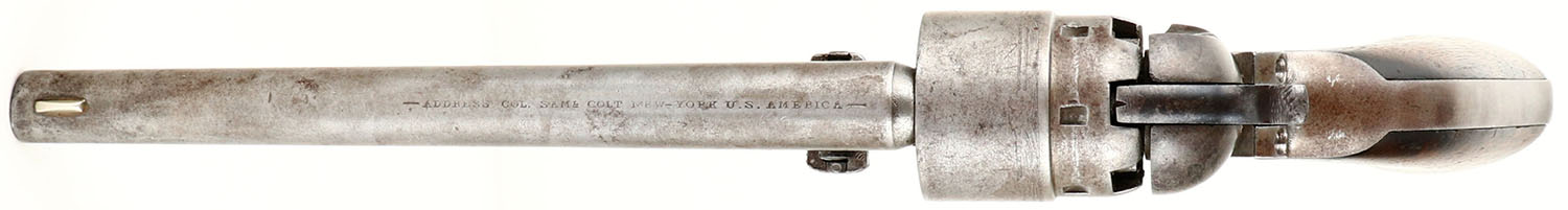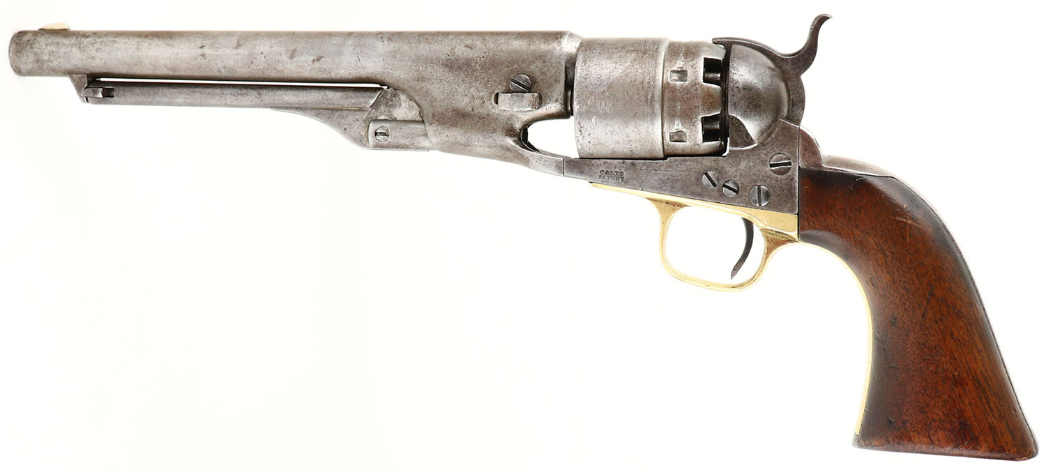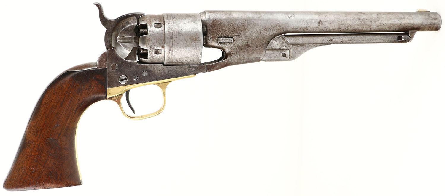 Colt, 1860 Army - U.S Military, CAL: .44, MFG: early 1862, SN: 29138, Single Action Percussion Revolver, 8'' round barrel. Martially marked. The original wood grips are very good, having been lightly sanded, with protective oils/finish added over time. The inspector cartouches on the grips are barely visible, but you can make out the outline of the initial box. The backstrap./butt is cut for a stock. The metal surfaces have fully worn to metal gray, with areas toned to a brown patina. The brass trigger guard is bright, having been cleaned. Bore is good, with intermittent pitting. Small blade front sight. The top of the barrel is marked ''ADDRESS SAM L COLT NEW- YORK U.S. AMERICA''. The left side of the frame is marked ''COLT'S PATENT''. The Texas Naval scene on the cylinder has worn smooth, but the patent markings, serial number & inspector mark are still visible. There are multiple inspector marks on the revolver, such as: ''T'' on the top of the backstrap, ''S'' on the trigger guard, behind the trigger loop, ''C'' on either side of the barrel, on the cylinder, between two nipples & ''B'' above the serial number on the cylinder. All matching SN on the frame, trigger guard, barrel, butt, cylinder & wedge. Antique, No FFL Req. - Value: 1000 to 2000