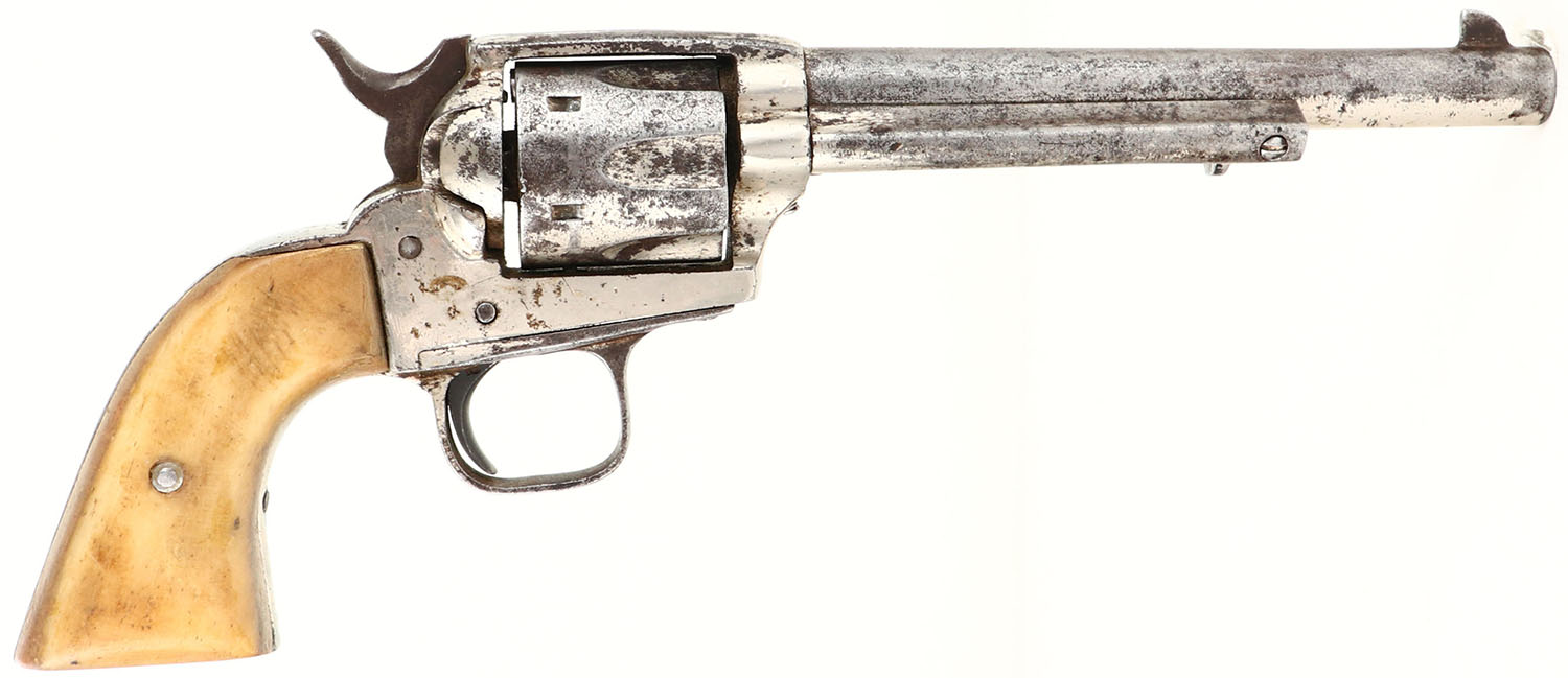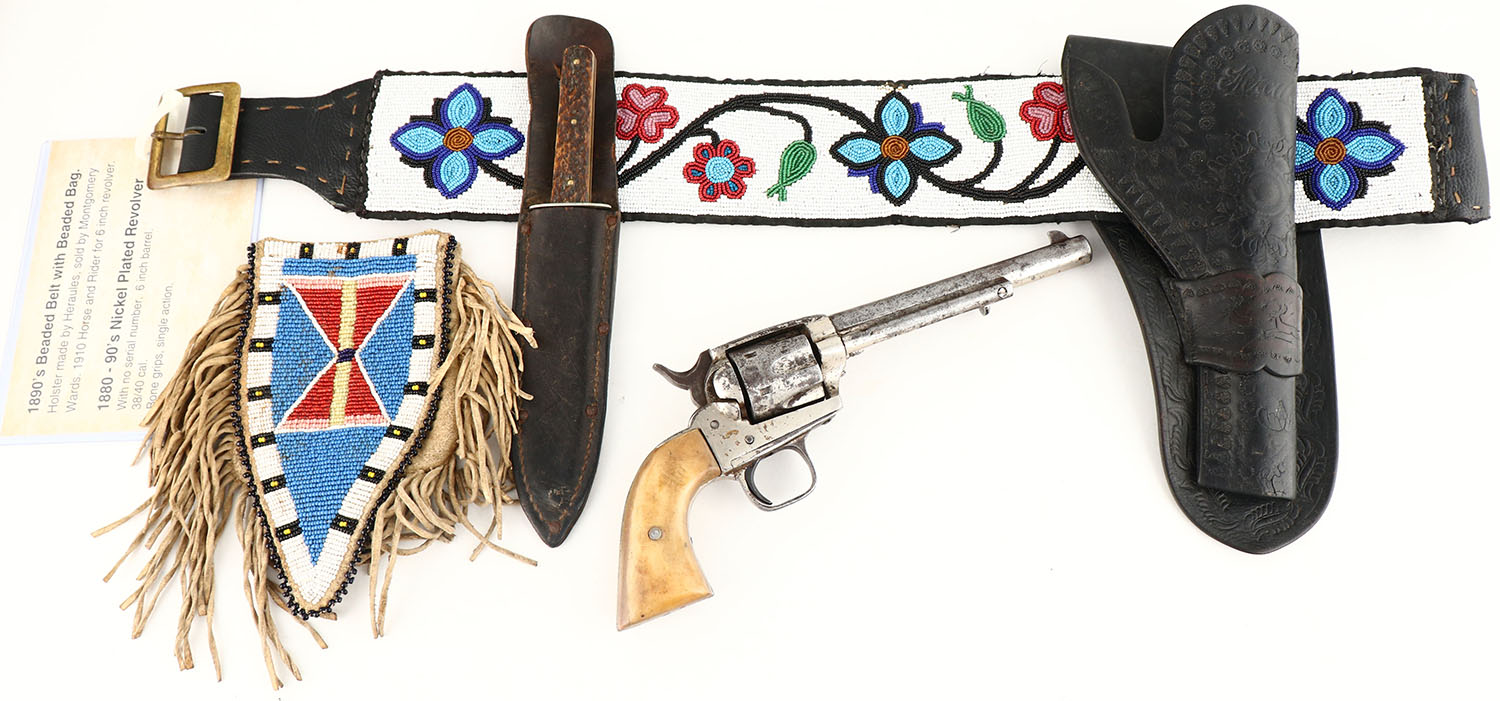 UNIQUE SET, European (Spain), Revolver, CAL: 36?, MFG: Pre 1898 (Antique), SN: NVSN, Single Action Revolver, 6'' barrel. The bone grips are good. They have scrapes, dings & an added layer of varnish that's mostly worn dull. The original nickel finish rates 30% on the barrel, with areas worn to metal gray & toned to a brown patina. The frame rates 60%, with areas worn to metal gray & toned to a brown patina. There is light pitting throughout the metal surfaces. Bore is poor, dark & rough. Small blade front sight. The top of the barrel is marked ''HAU-DA EBBEVOLVERIKAN FUERTIENA EUSKARTAN EGITANDANA''. A rough translation is ''This is the strongest revolver I have done'' in the language of Basque, according to Google translate. Mechanical function appears to operate properly. Basque is a language spoken by residents of the Basque Country, a region that straddles the westernmost Pyrenees in adjacent parts of northern Spain & southwestern France. Basque is classified as a language isolate (unrelated to any other known languages) and the only language isolate in Europe. This gun is accompanied by a hand made black leather Native American beaded belt, with beaded bag, circa 1890's, it is 3 1/3'' wide. The pouch is in the image of an hourglass, made of blue, red, pink, black, white & yellow seed beads. The beaded image consists of a white body & floral arrangements, with black vines & blue, red, green & gold flowers made from seed beads. The belt carries a Hercules single loop holster that's been hand tooled with floral patterns & decorative border, an unmarked knife sheath that holds a WEST-CUT Boulder, Colo. blade. The blade has intermittent spotting toned to a brown patina & an antler handle. A unique set that would present wonderfully in an Old West or Native American collection. FFL or C&R Req. - Value: 1000 to 3000