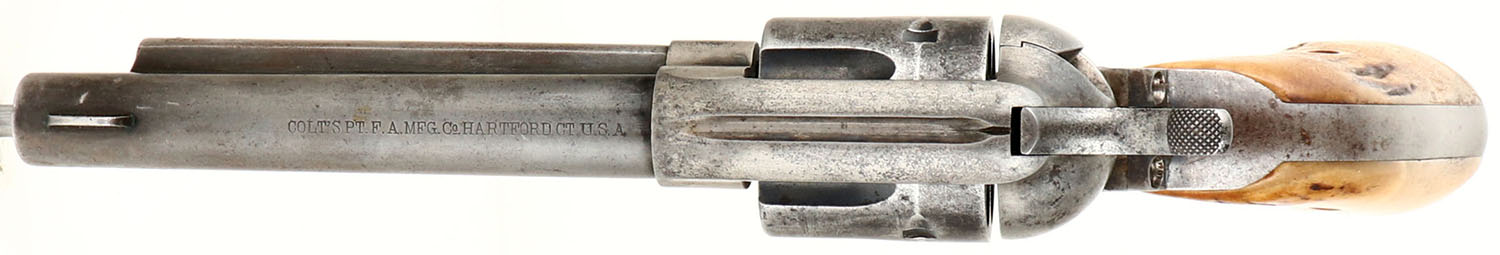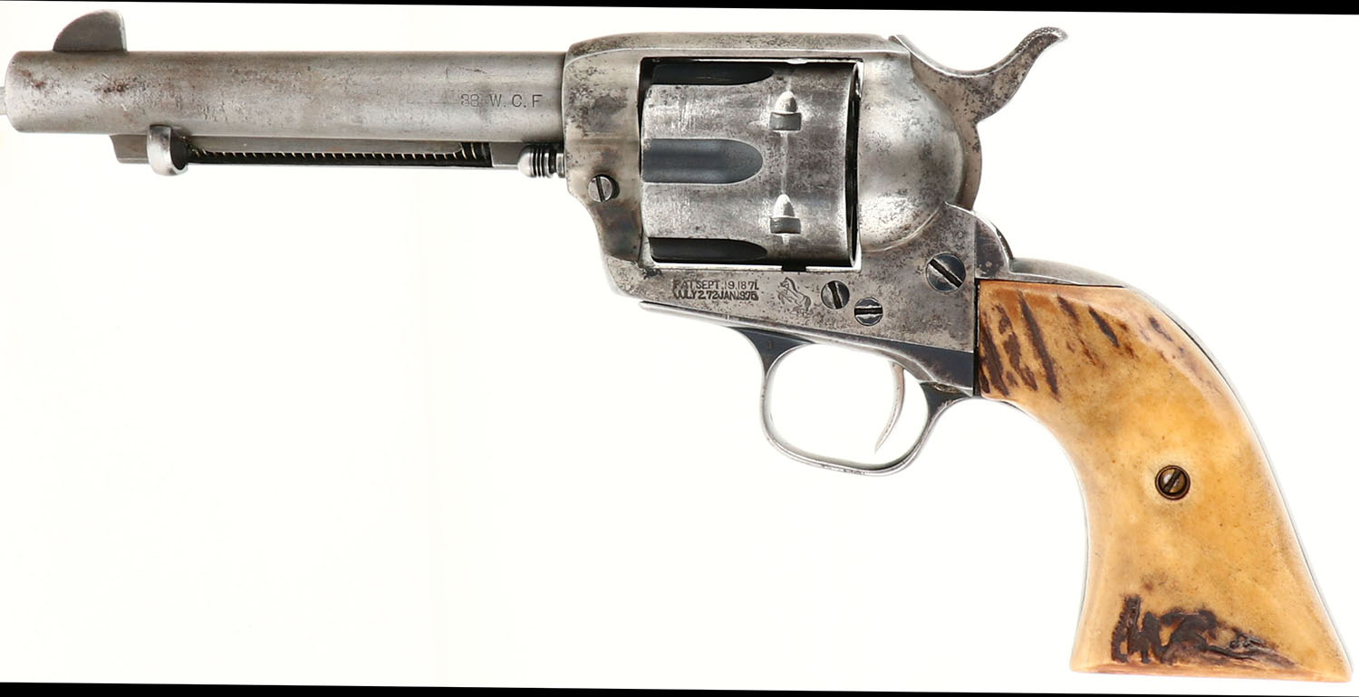 UNIQUE SET, Colt, 1873 Single Action Army, CAL: 38 WCF, MFG: 1920, SN: 339245, Single Action Revolver, 5 1/2'' barrel. The authentic Stag grips are excellent. The edges are smooth & they have a nice aged caramel patina. The original metal blue finish on the barrel has worn to metal gray & toned to a brown patina, with small traces of original blue left in protected areas. The case-hardened frame retains small amounts of visible case-colors in heavily protected areas, with some shadowing remaining, but mostly worn to metal gray, with spotting toned to a brown patina. Bore is very good & bright, with intermittent roughness. V-notch rear sight & dorsal fin blade front sight. Mechanical function is excellent. This revolver is accompanied by a circa 1890's leather ammo belt marked ''WM R. BURKHARD CO. SPORTING GOODS ST. PAUL, MN'' with loops for 30 cal cartridges. The belt carries a circa 1890-1900 Merwin & Bray double loop holster, marked ''WB'' on the front, & a ''K.A Coleman Maker Halsey, OR'' tooled knife sheath. The sheath carries an Original Bowie Knife marked ''G.C CO SOLINGEN, GERMANY #445''. A unique set that would present wonderfully in a Colt or Native American collection. FFL or C&R Req. - Value: 2000 to 5000