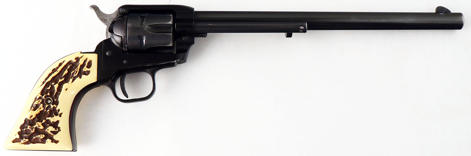 Colt, Single Action Buntline Scout, CAL: 22MAG, MFG: 1960, SN: 124925F, Single Action Revolver, 9 1/2'' barrel. The faux stag grips are excellent. The original metal blue finish on the barrel rates 85% & the matte black finish on the alloy frame rates 95%. Bore is excellent. Integral square notch rear sight & blade front sight. FFL or C&R Req. - Value: 300 to 500