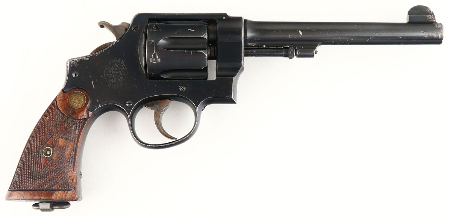 WWI Smith & Wesson, MK II Hand Ejector, CAL: 455, MFG: 1908-15, SN: 48982, Double Action Revolver, 6 1/2'' barrel. The original S&W logo medallion checkered wood grips are good. The right grip has a crack from bottom to top & there are other contusions, dings & scrapes throughout. The original metal blue finish rates 85% overall. There are a couple areas of concentrated pitting/loss on the muzzle & frame knuckle, a long with other minor handling marks throughout. Bore is excellent. U-notch rear sight & tall round blade front sight.