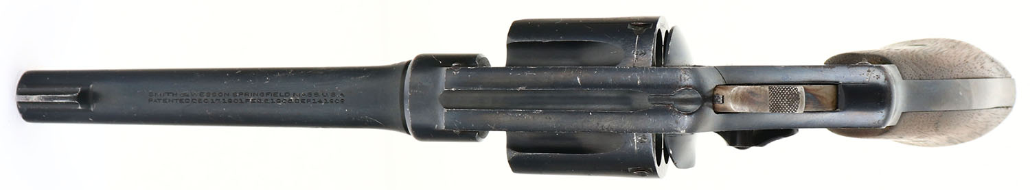 WWI, Smith & Wesson, US Army Model 1917 - England Lend Lease, CAL: 45 ACP, MFG: 1918, SN: 96804, Double Action Revolver, 5 1/2'' barrel. The original smooth wood grips are very good & solid. The top front corner of the right grip has an edge chip, along with other contusions & dings throughout. The original metal blue finish rates 95% overall, with intermittent chatter marks & light spotting, toned to a brown patina. Bore is excellent. The case-hardened trigger & hammer retain excellent case-colors. U-notch groove rear sight & tall round blade front sight. Standard S&W address & patent dates on the barrel. British proofs can be seen on the right side of the frame, barrel & on the cylinder. The right side of the frame is marked ''NOT ENGLISH MAKE''. US proofs can be seen on the left side of the frame & inside cylinder housing. The butt is marked ''US ARMY MODEL 1917 No. 96804. (Credit: Pistols of World War I by Robert J. Adamek) '' Only several thousand 1917's were sent to England during the great war and are not commonly encountered.'' FFL or C&R Req. - Value: 1200 to 1800
