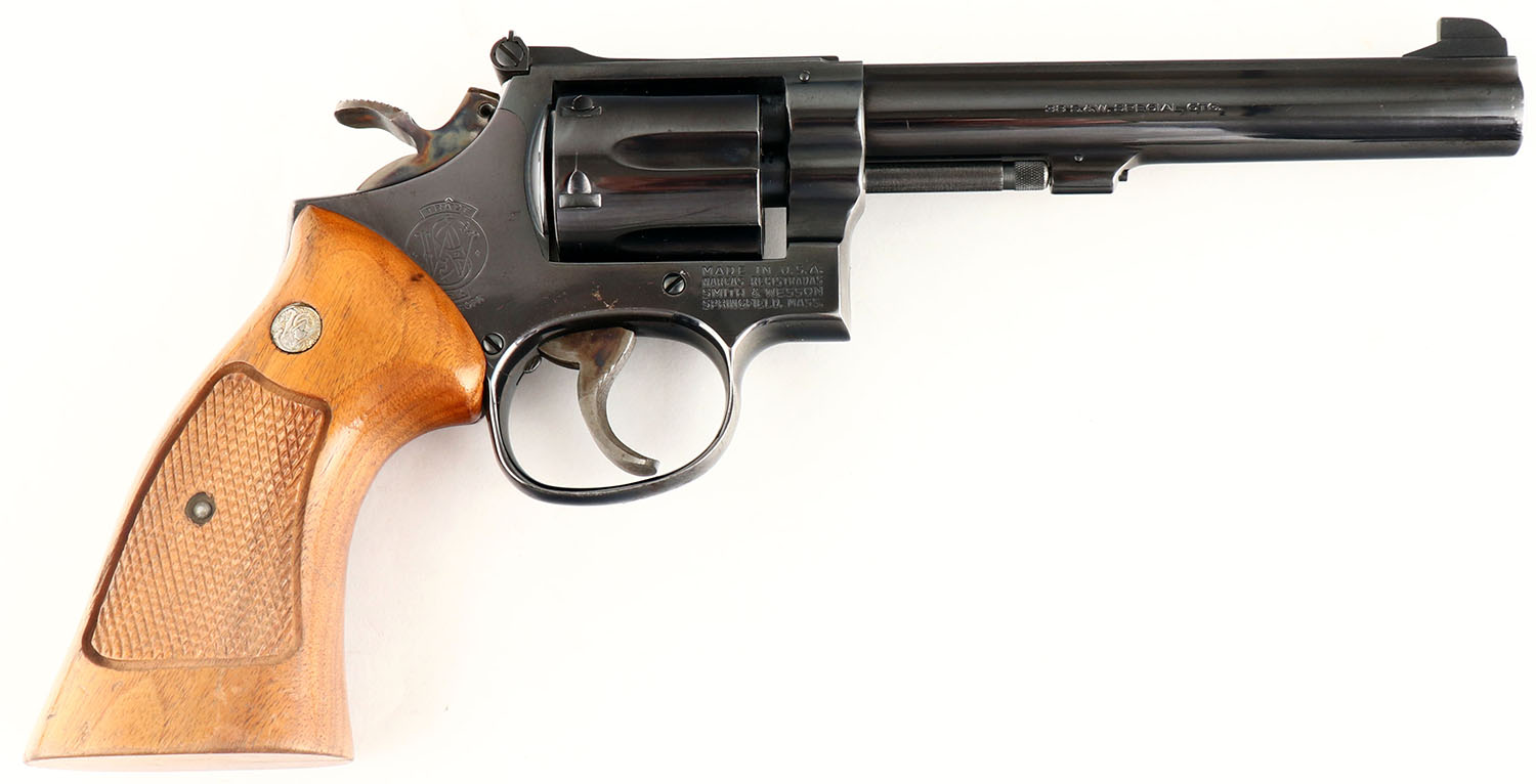 Smith & Wesson, Model 14-3, CAL: 38 S&W SPL, MFG: 1977, SN: 16K3100, Double Action Revolver, 6'' barrel. The S&W logo medallion checkered wood grips are very good. There are contusions, dings & areas of the high gloss finish are beginning to dull. The original metal blue finish rates 90% overall, with concentrated wear to the muzzle & intermittent speckling on the frame, toned to a brown patina. Case-hardened trigger & hammer. Bore is excellent. Adjustable rear sight & ramp elevated blade front sight. FFL Req. - Value: 400 to 600